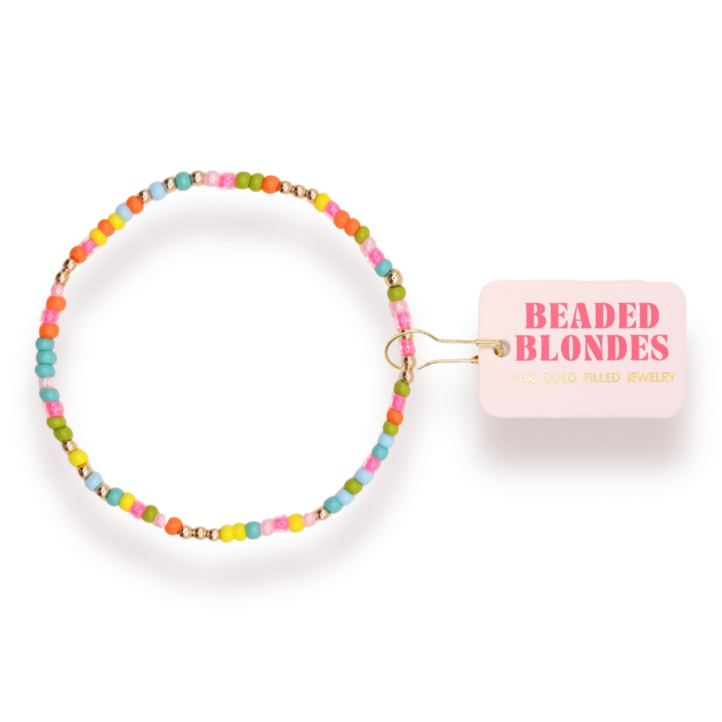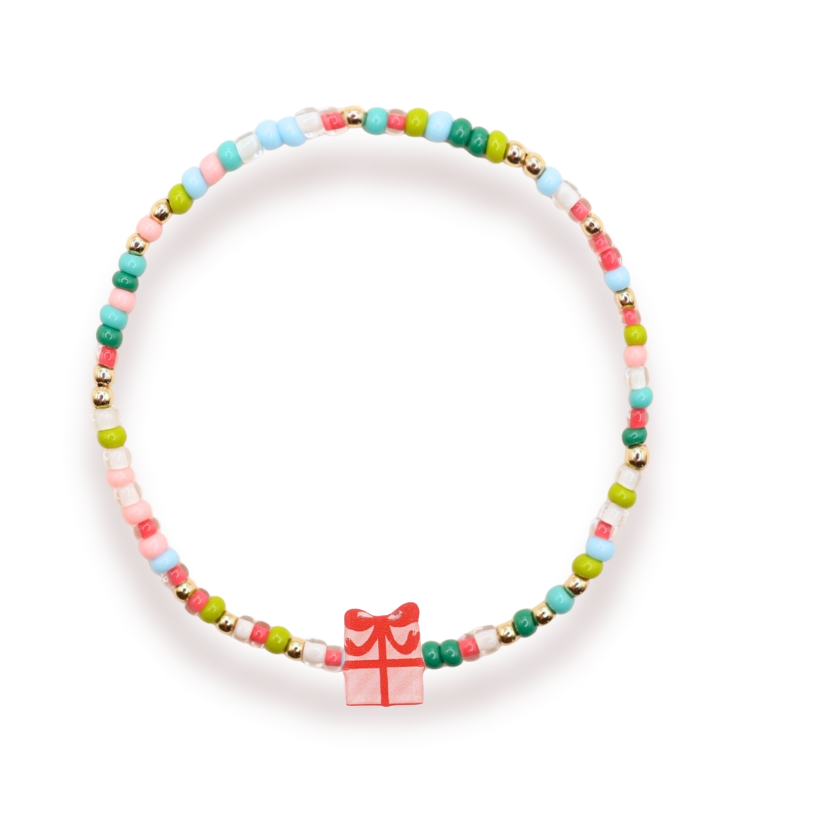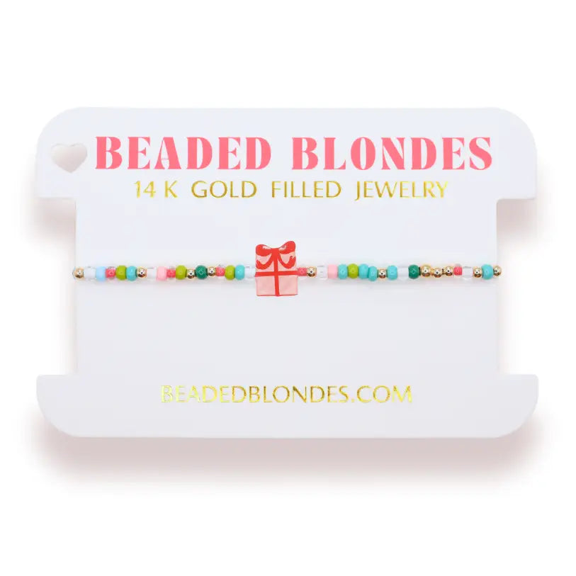 Part of the Beaded Blondes Holiday Collection. Our Holiday Gift Bracelet is available on gold or sprinkle making it perfect to add to your stack for the holidays. * The sprinkle is a mix of 2.5mm & czech glass beads. The pattern varies on each bracelet making it unique. Features acrylic bead that will not fade.