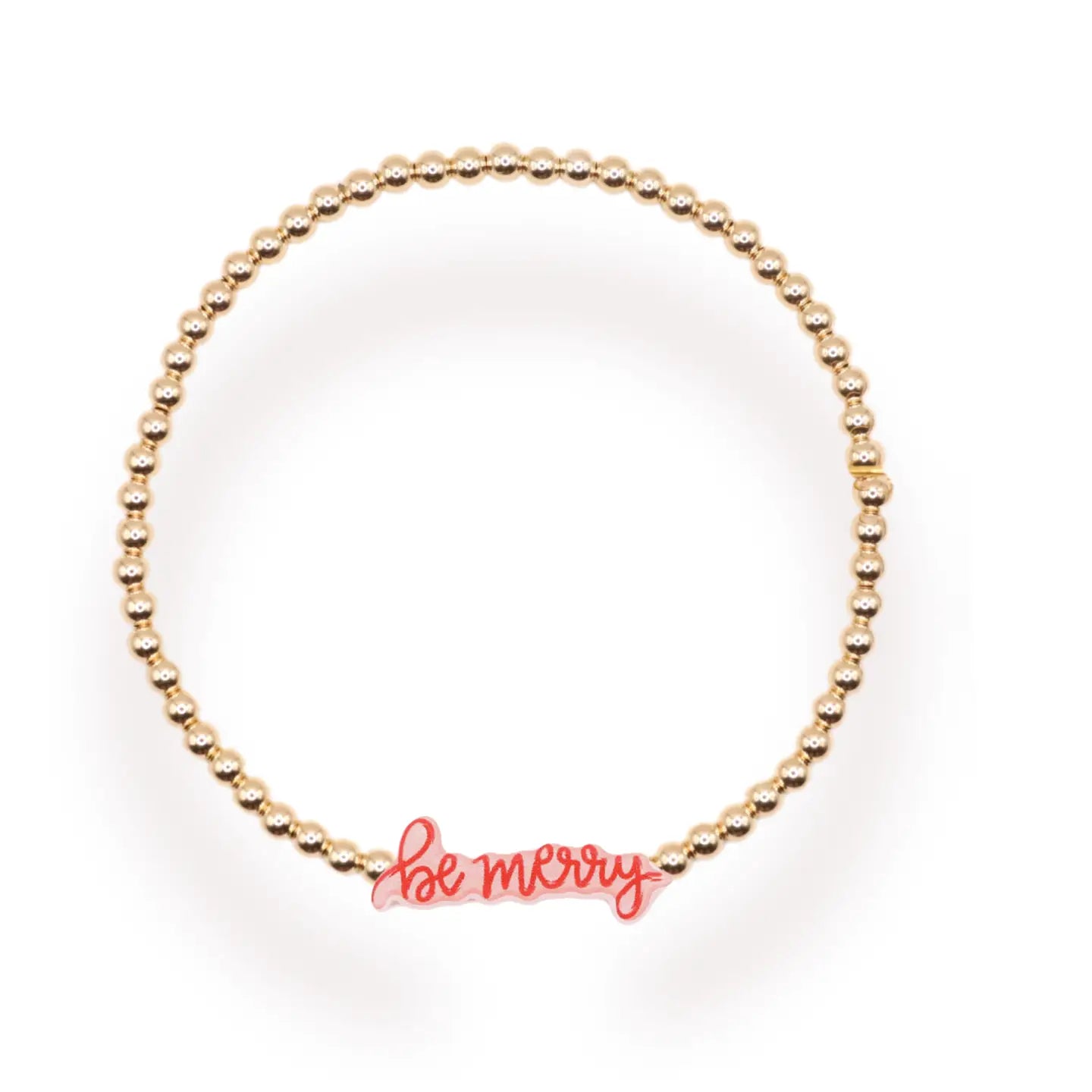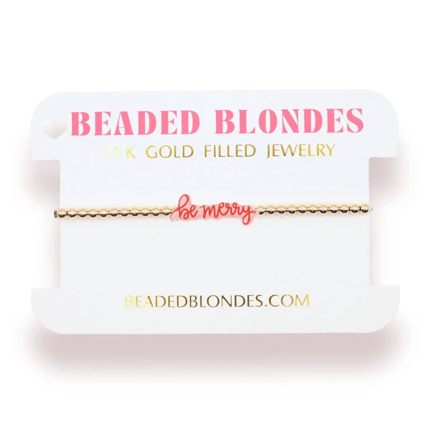 Part of the Beaded Blondes Holiday Collection. Our Be Merry Bracelet is available on gold or sprinkle making it perfect to add to your stack for the holidays. * 3MM gold beaded stretch bracelet with an acrylic bead that will not fade.