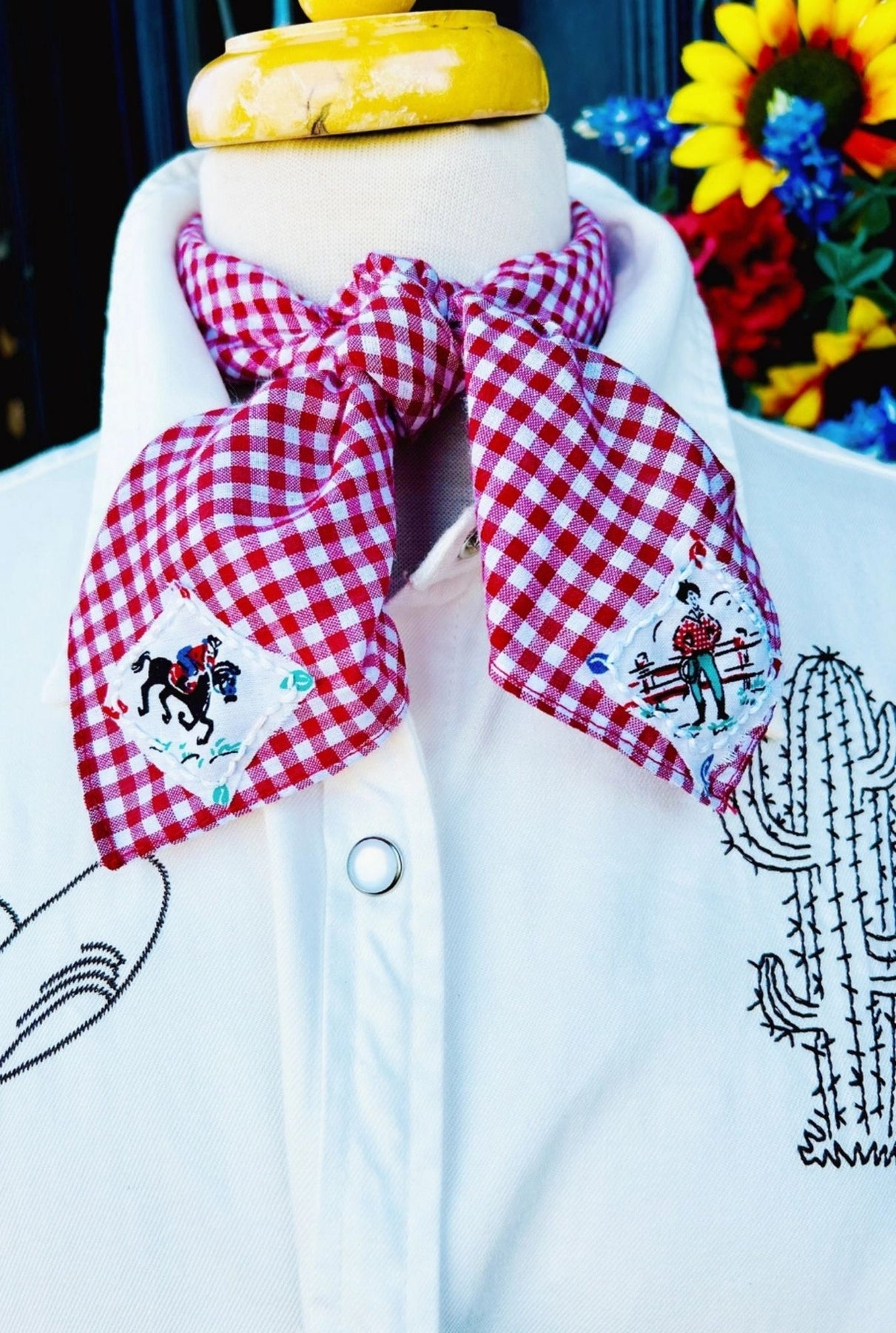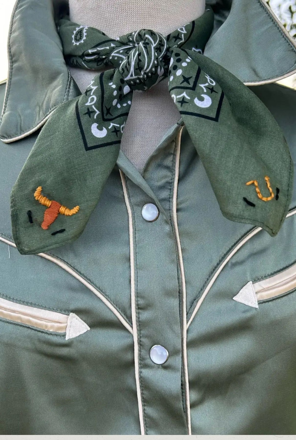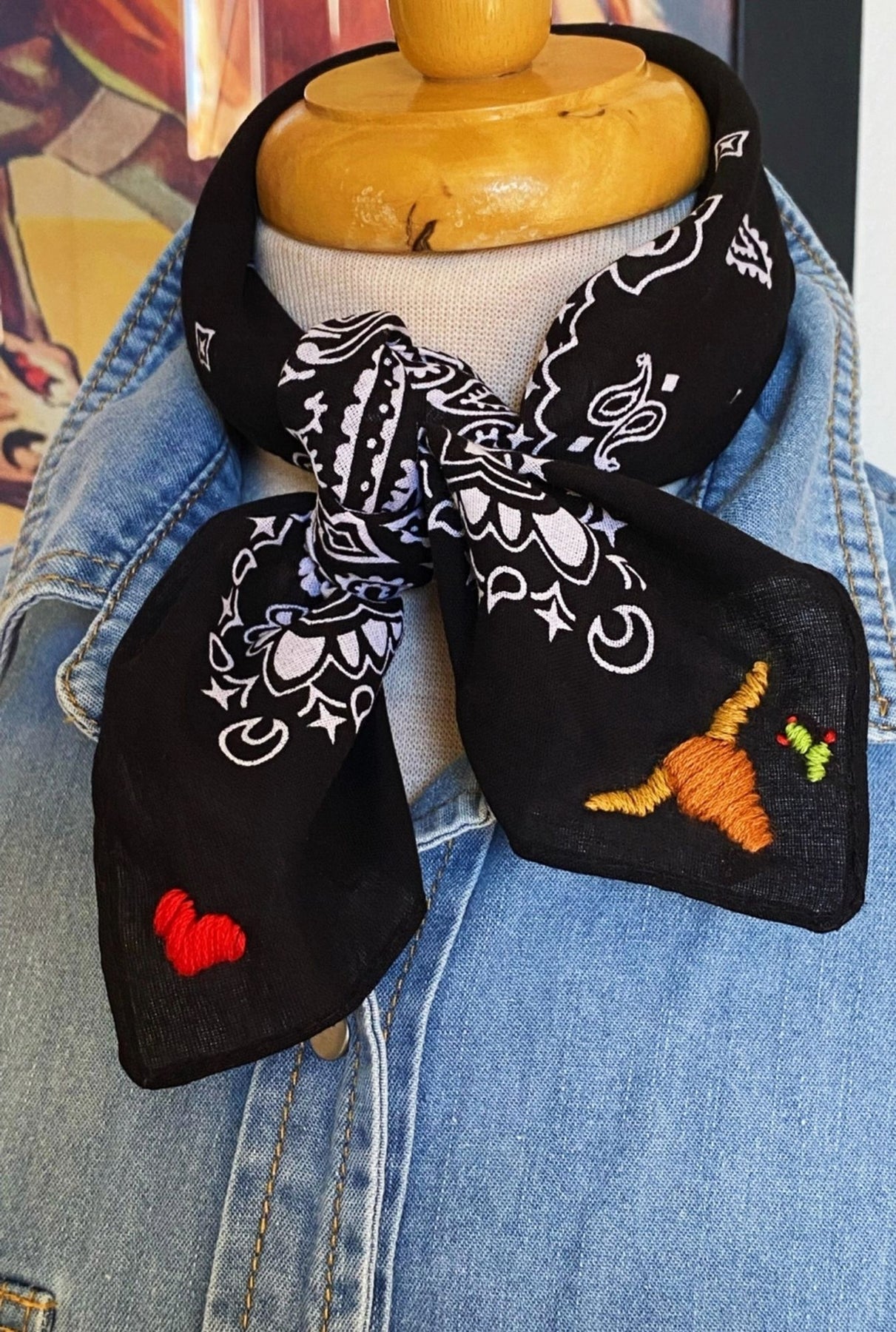 Introducing the Embroidered Chisholm Trail Bandana from Pradera - Purveyors of the West. Crafted by Lisa, a seasoned stylist and store owner, this bandana is a unique blend of fun and Western flair. Each piece is meticulously hand-drawn and embroidered, adding a distinct touch to your accessories. Perfect for women who appreciate a touch of the West in their style.