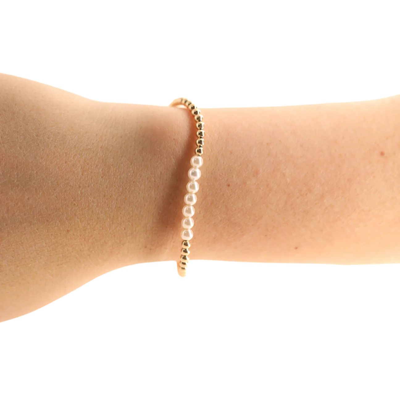Gold 3mm with 7 freshwater pearls. Our gold stackable beaded bracelets are available in a variety of bead sizes and lengths to fit every wrist. Made from 14 k gold filled beads so perfect for everyday wear! Sweat proof, water proof and tarnish free!