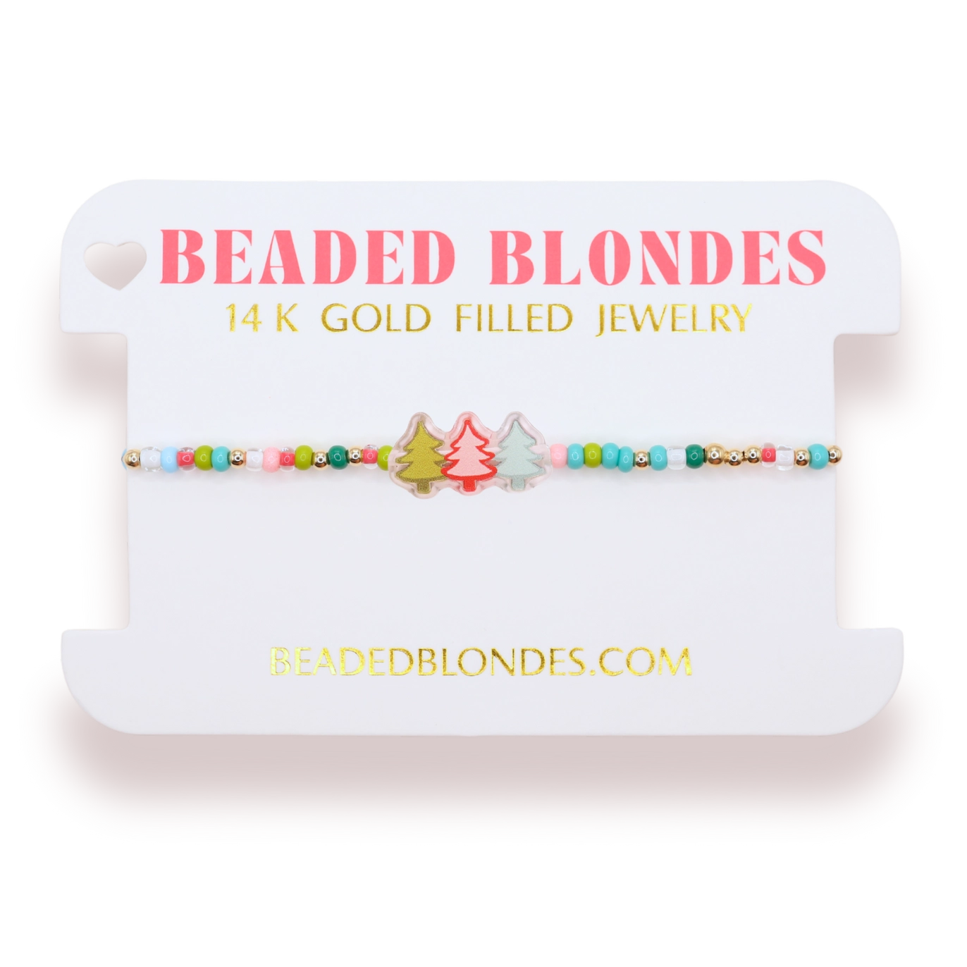 Part of the Beaded Blondes Holiday Collection. Our Tree Trio Holiday Bracelet is available on gold or sprinkle making it perfect to add to your stack for the holidays. * 3MM gold beaded stretch bracelet with an acrylic bead that will not fade. * 14 K gold filled & elastic string