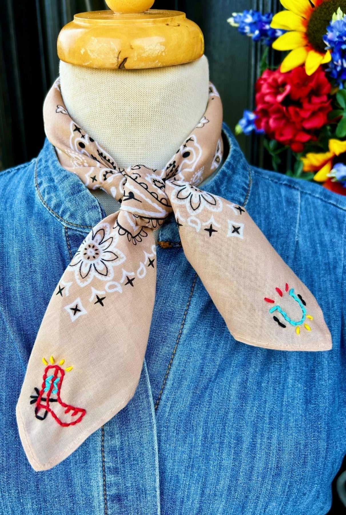 Introducing our Embroidered Lucky Boots Bandana, a unique accessory for women. This piece, a product of Pradera - Purveyors of the West, is designed with a western flair, hand-drawn and hand-embroidered for that unique touch. This bandana is not just an accessory but a testament to the western style. Styled by Lisa, a stylist and store owner with a connection to rodeo culture.