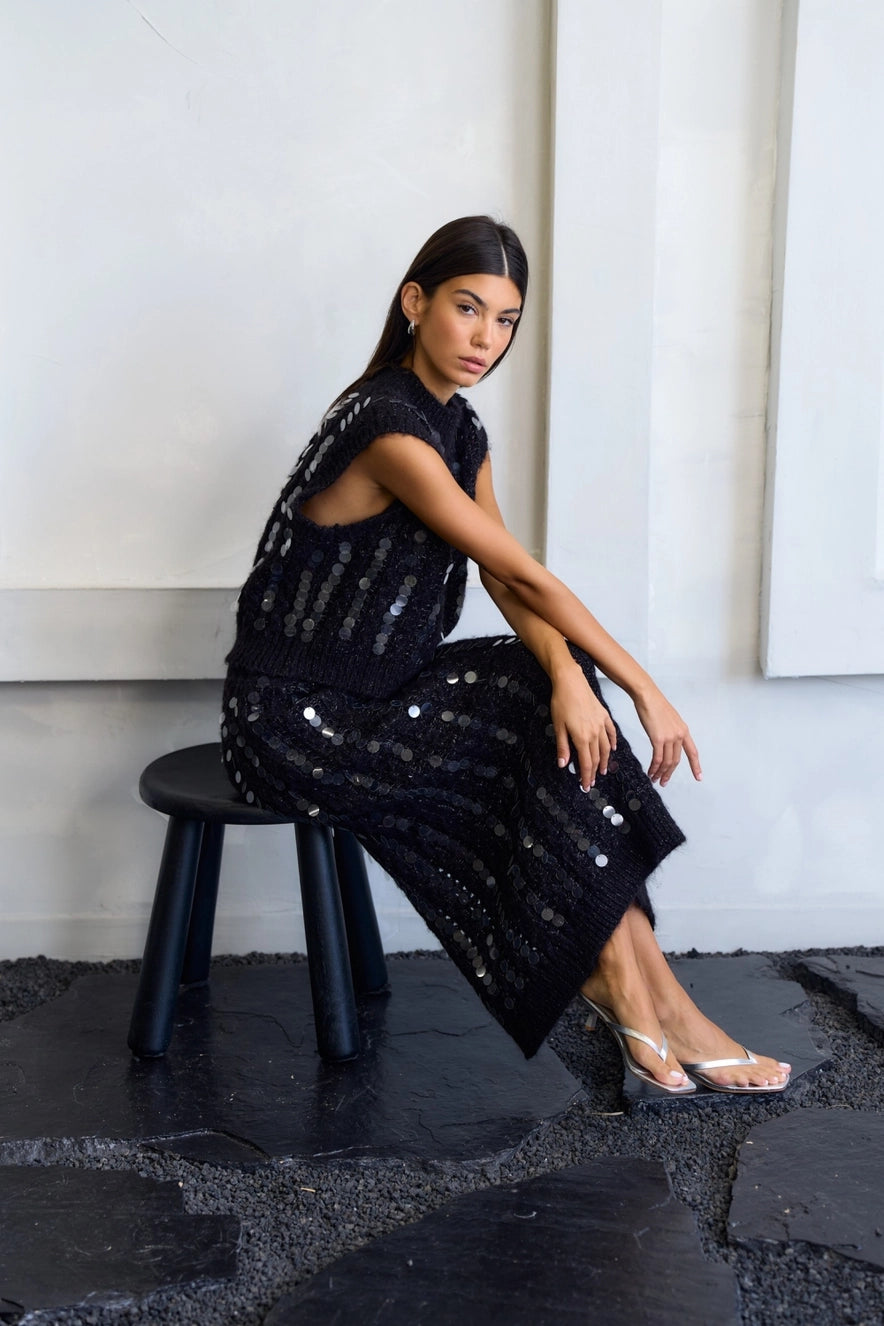Top stitch sleeveless midi dress in linen fabric. This dress features button down closure at front, sleeveless design, chest pockets, elasticated waist at back, side pockets, V neck with spread collar, belt loops, lining, and contrast top stitching detail throughout.