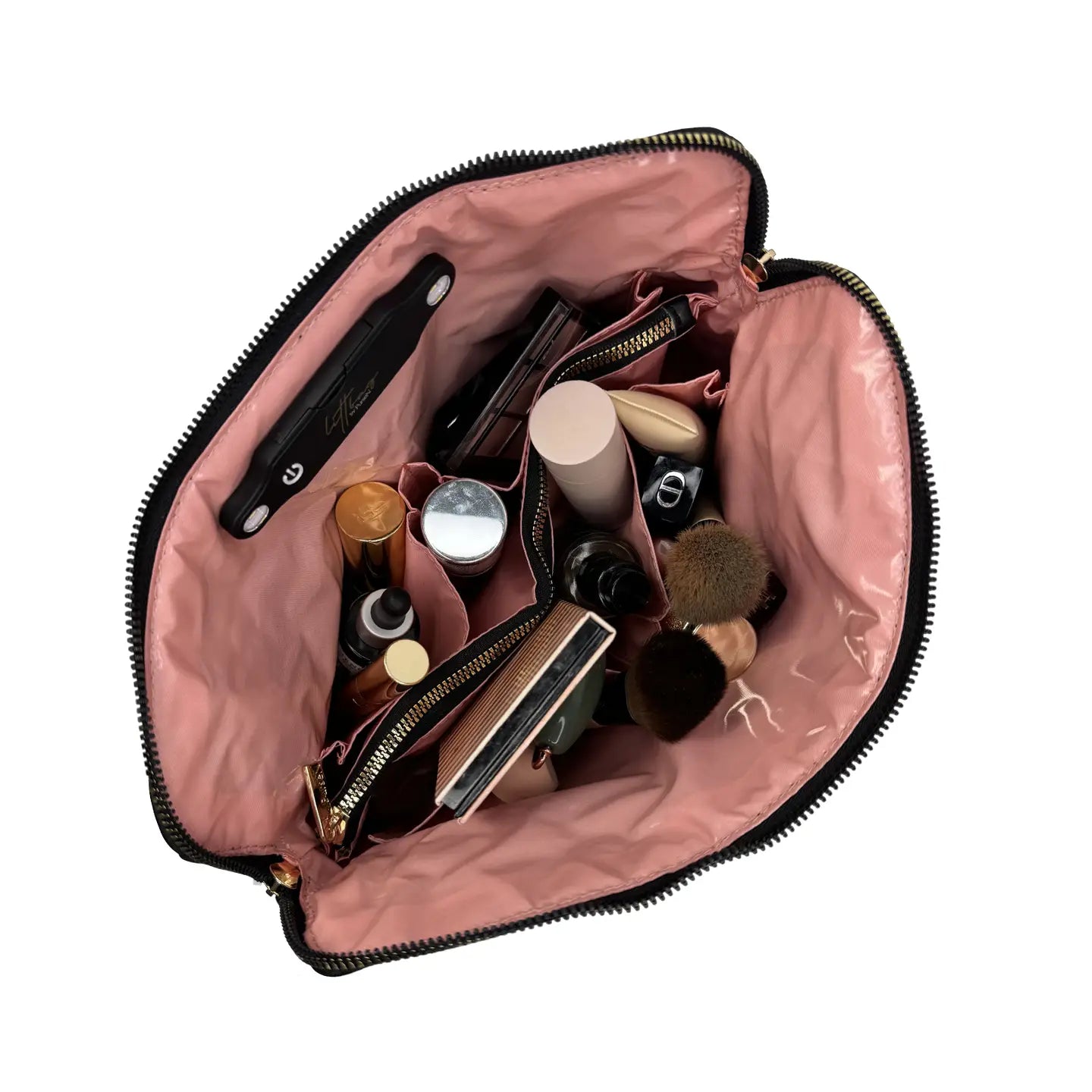 Ensure you never fumble in the dark looking for your essentials again. This large makeup case has with a detachable wristlet that makes it easy for this case to double as a chic clutch. Seamlessly transition from day to night, effortlessly carrying your keys, lipstick, and even a passport. The design includes a middle divider with a zipper closure that keeps your items securely in place, while the four interior pockets provide a dedicated space for your smaller essentials.