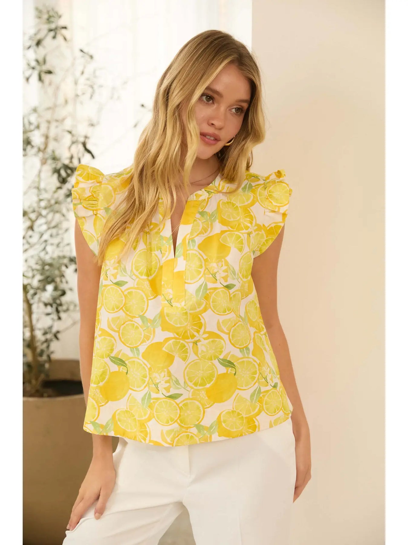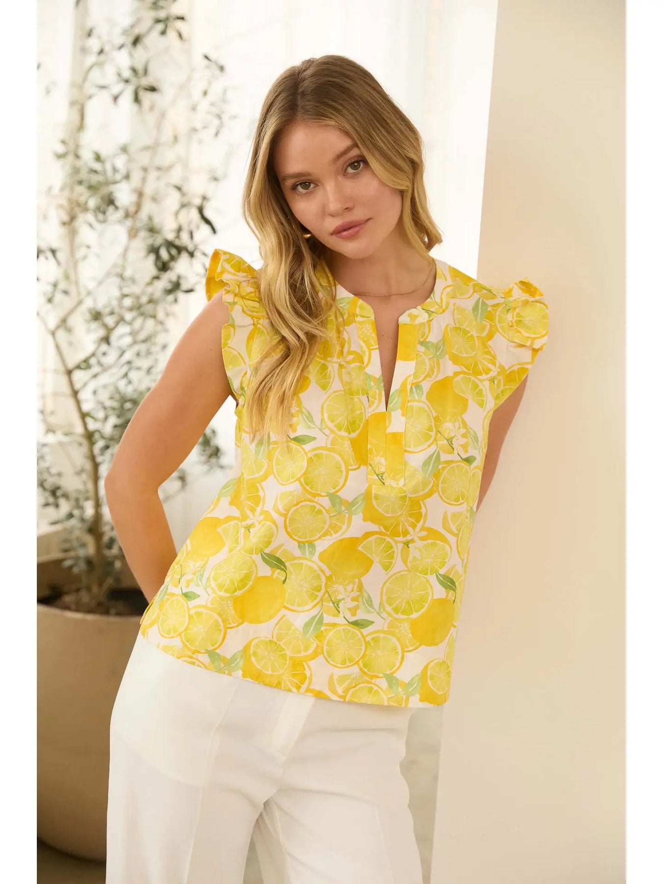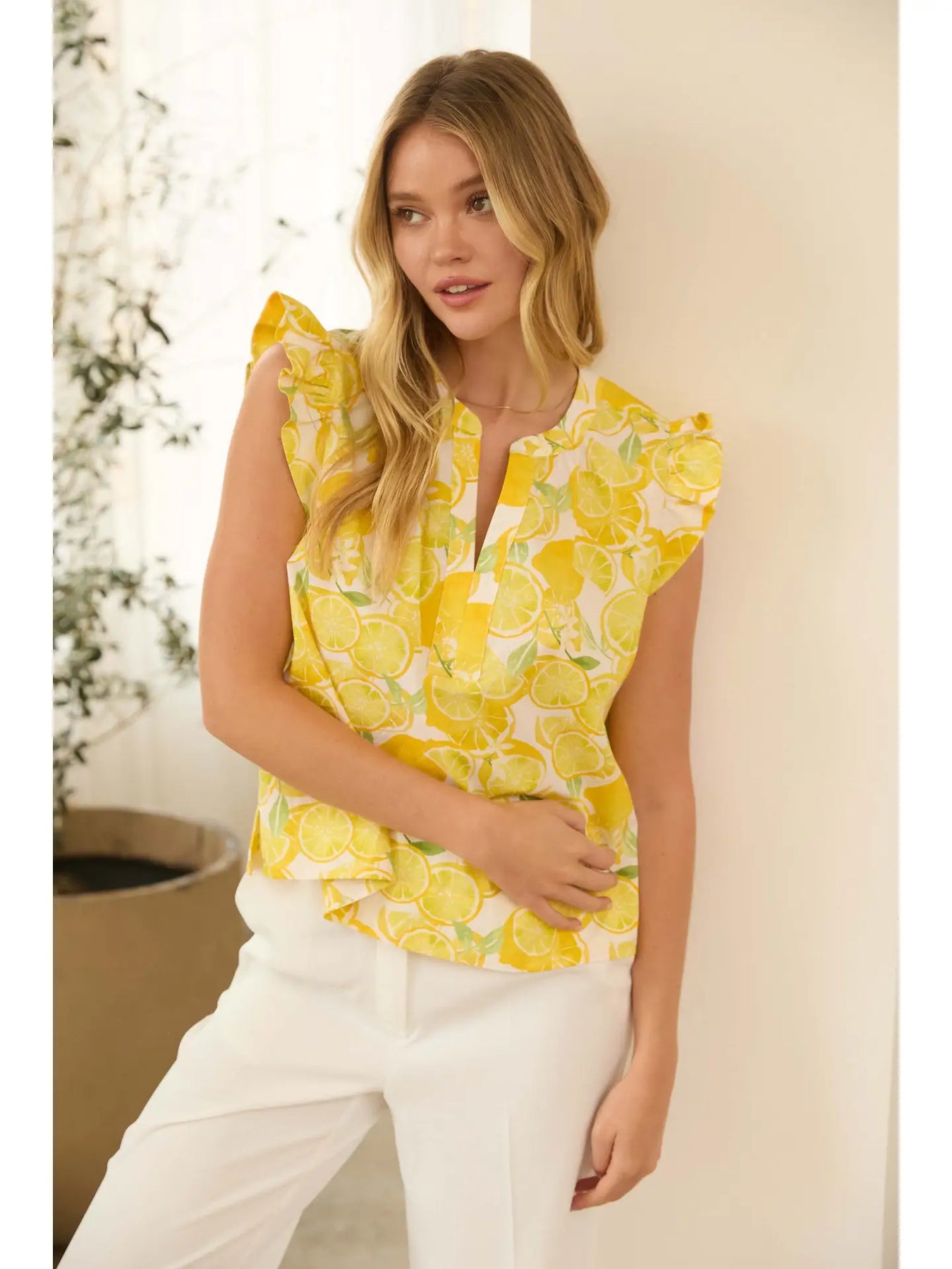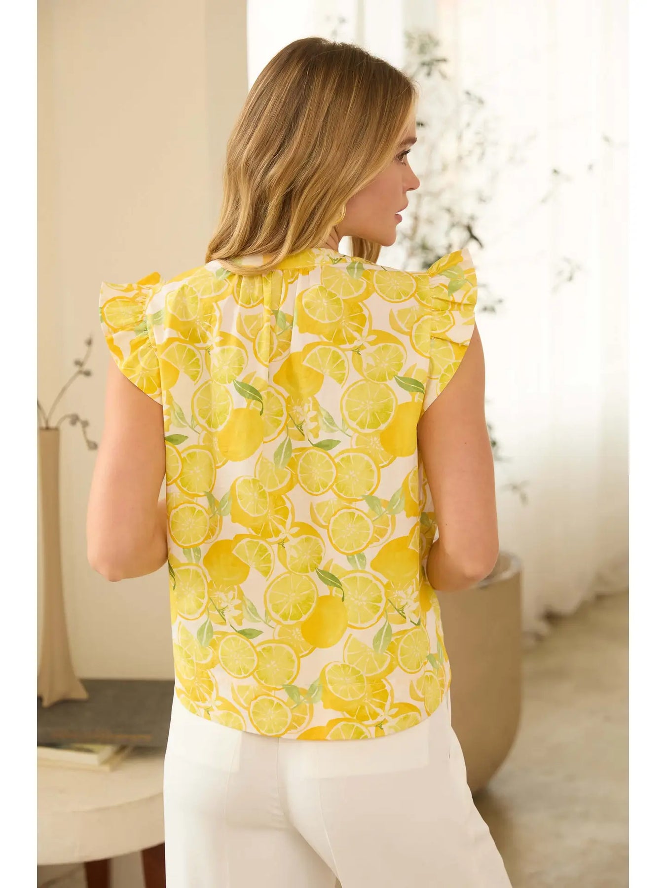 This sleeveless poplin top features a playful lemon print that adds a fresh, cheerful touch to warm-weather styling. Crafted from crisp, lightweight cotton poplin, it offers a breathable feel with a clean, structured silhouette. Perfect for spring and summer wear, this easy top pairs effortlessly with denim, skirts, or tailored pants. Ideal for casual outings, vacation looks, or sunny weekend days, it brings a bright pop of color to any outfit.