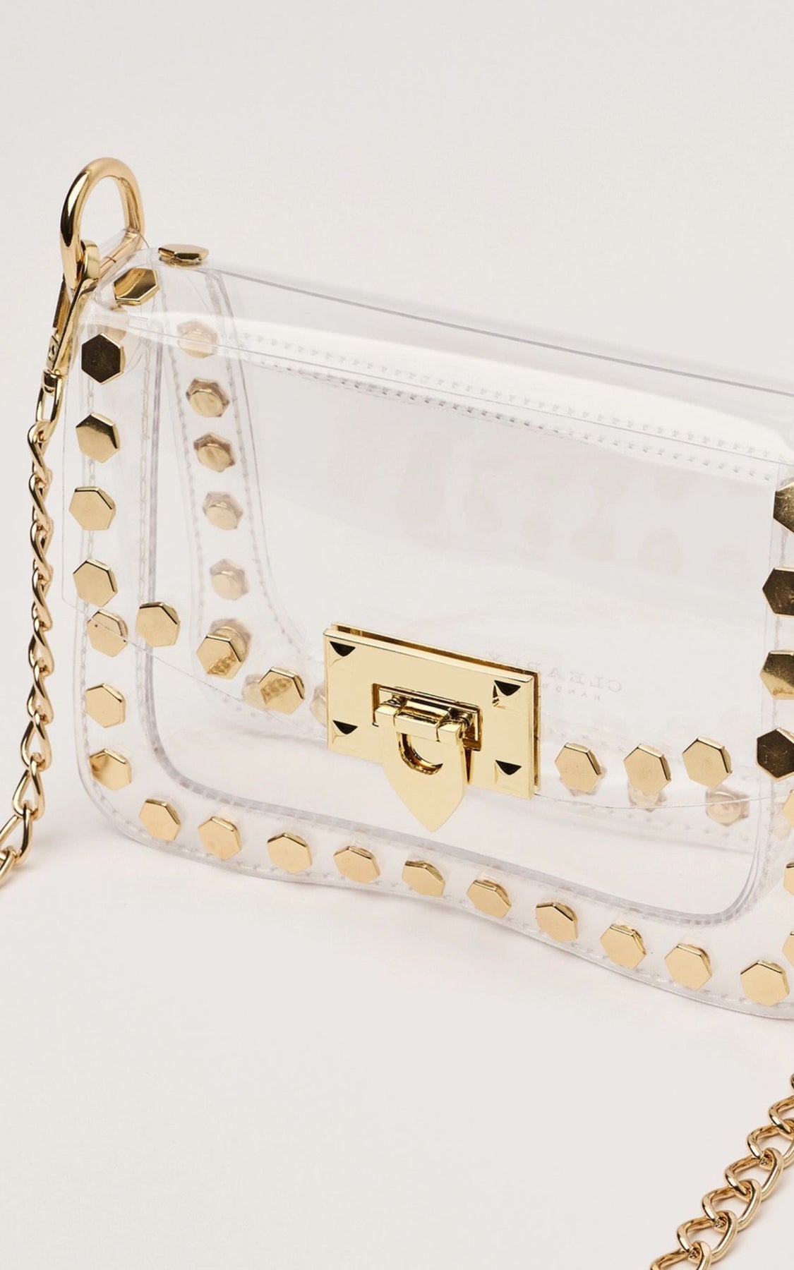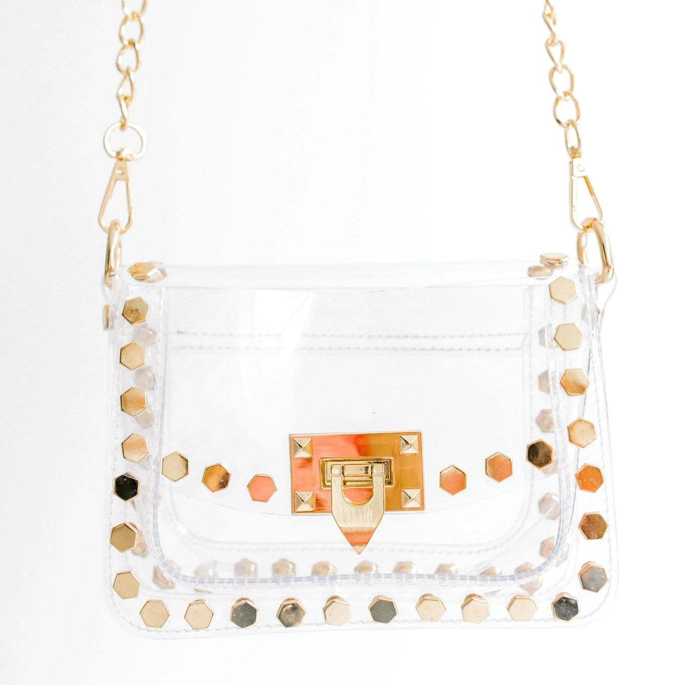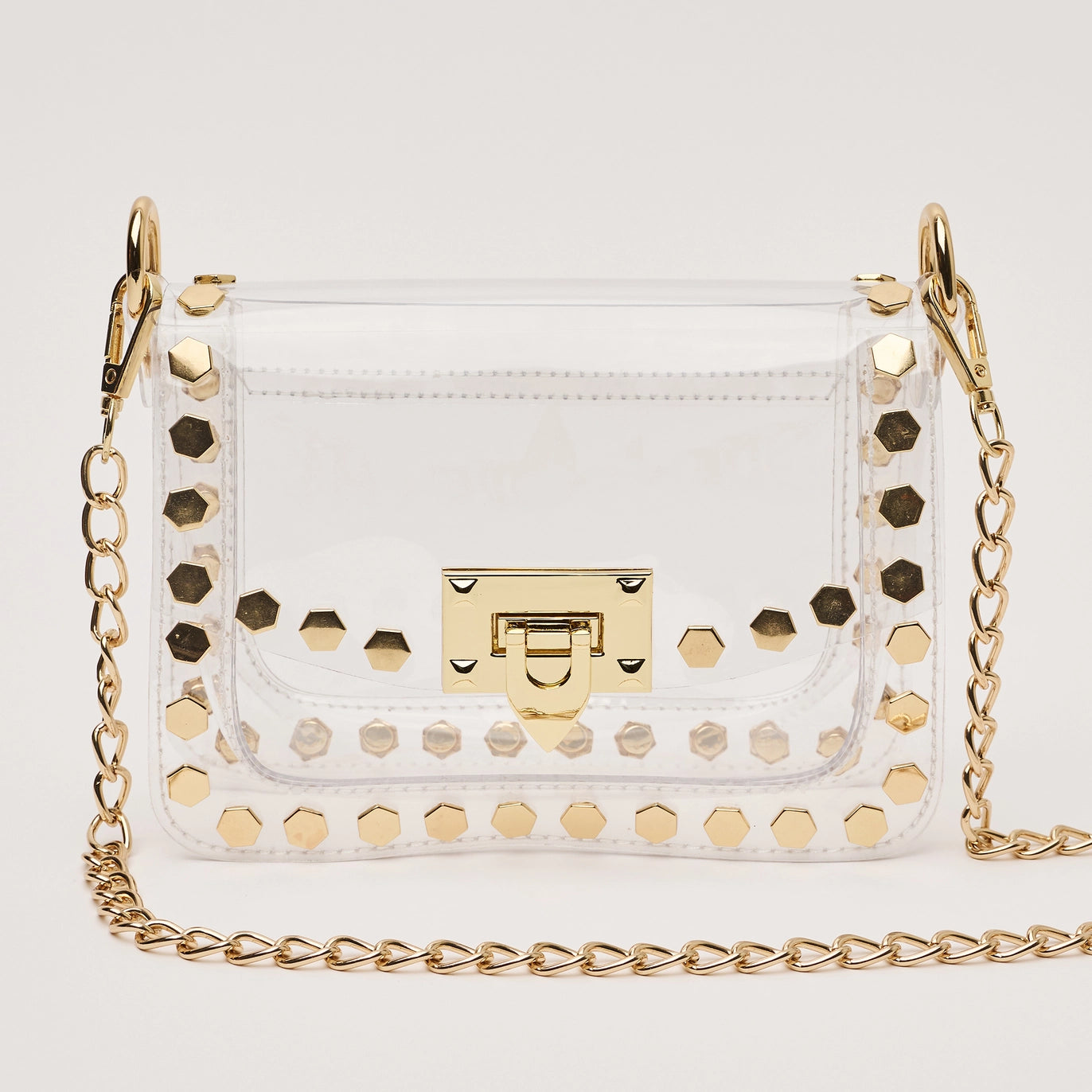 Score with the biggest winner in our clear handbag playbook - The Jackie! The Jackie changed the handbag game by proving clear handbags could be both functional and chic. This style includes alternating black and red square metal studs and a gold chain. The Jackie is NCAA and NFL-compliant and the ideal size to hold your wallet, phone, keys, lip gloss, and a few other small items.