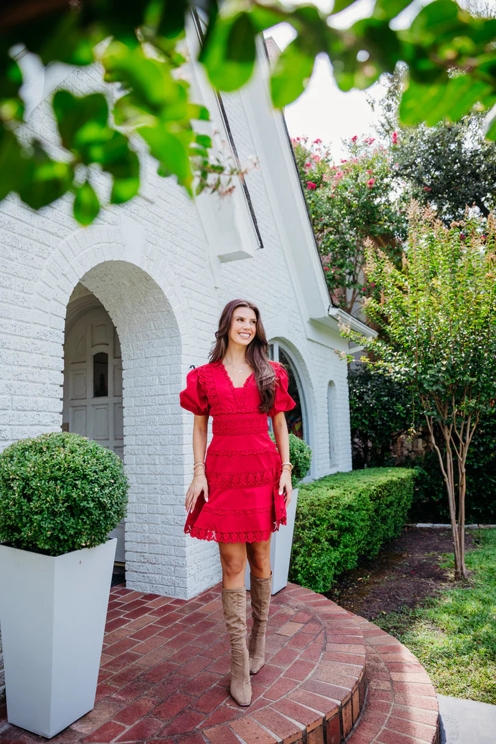 This festive red dress is made for the holiday season 🎄✨ With its flattering fit-and-flare silhouette, puff sleeves, and intricate lace detailing, it’s the perfect blend of sweet and chic. Pair it with tall suede boots or sparkly heels for all your Christmas parties, dinners, and merry gatherings. A total showstopper that captures the spirit of the season! ❤️