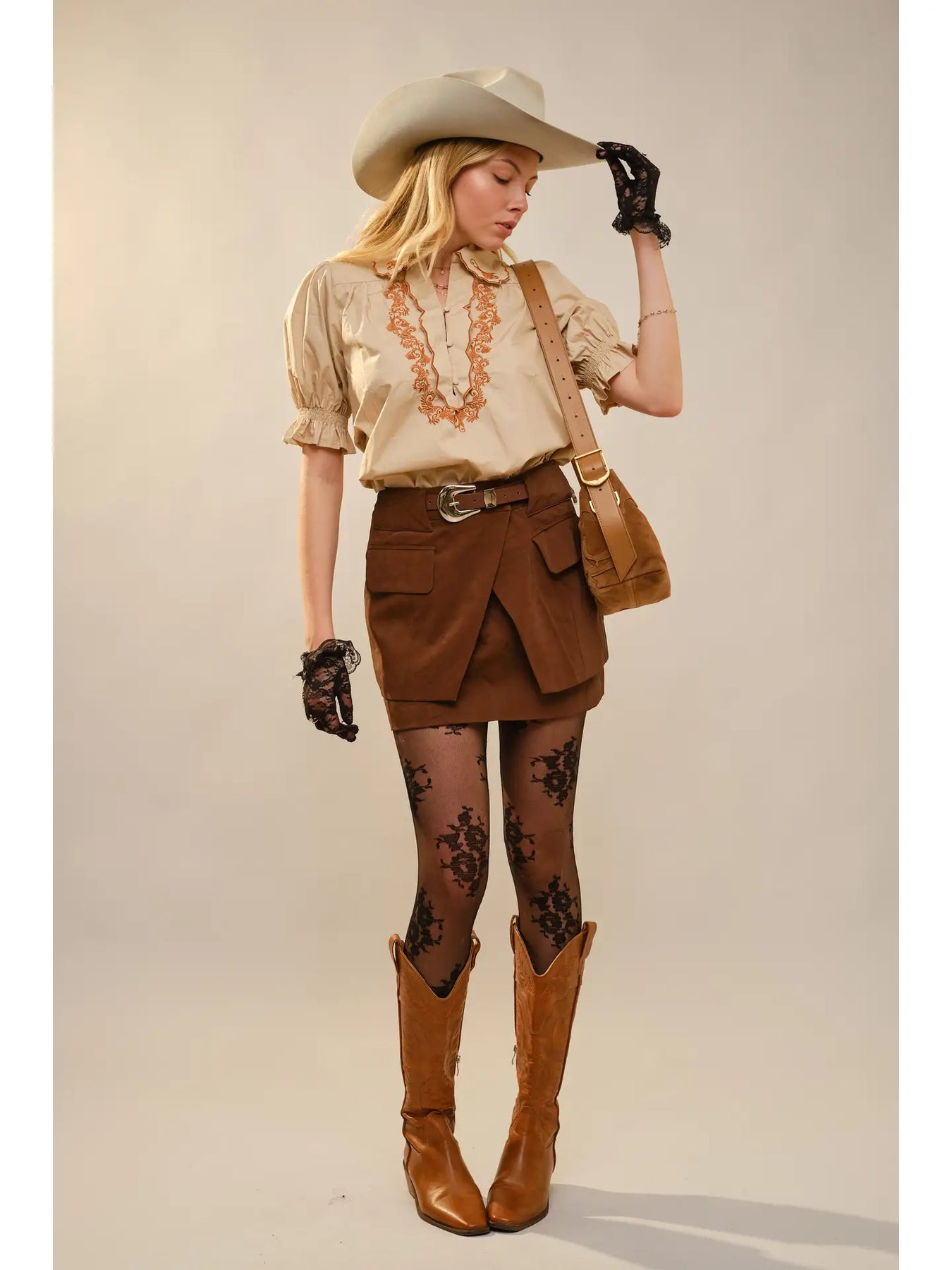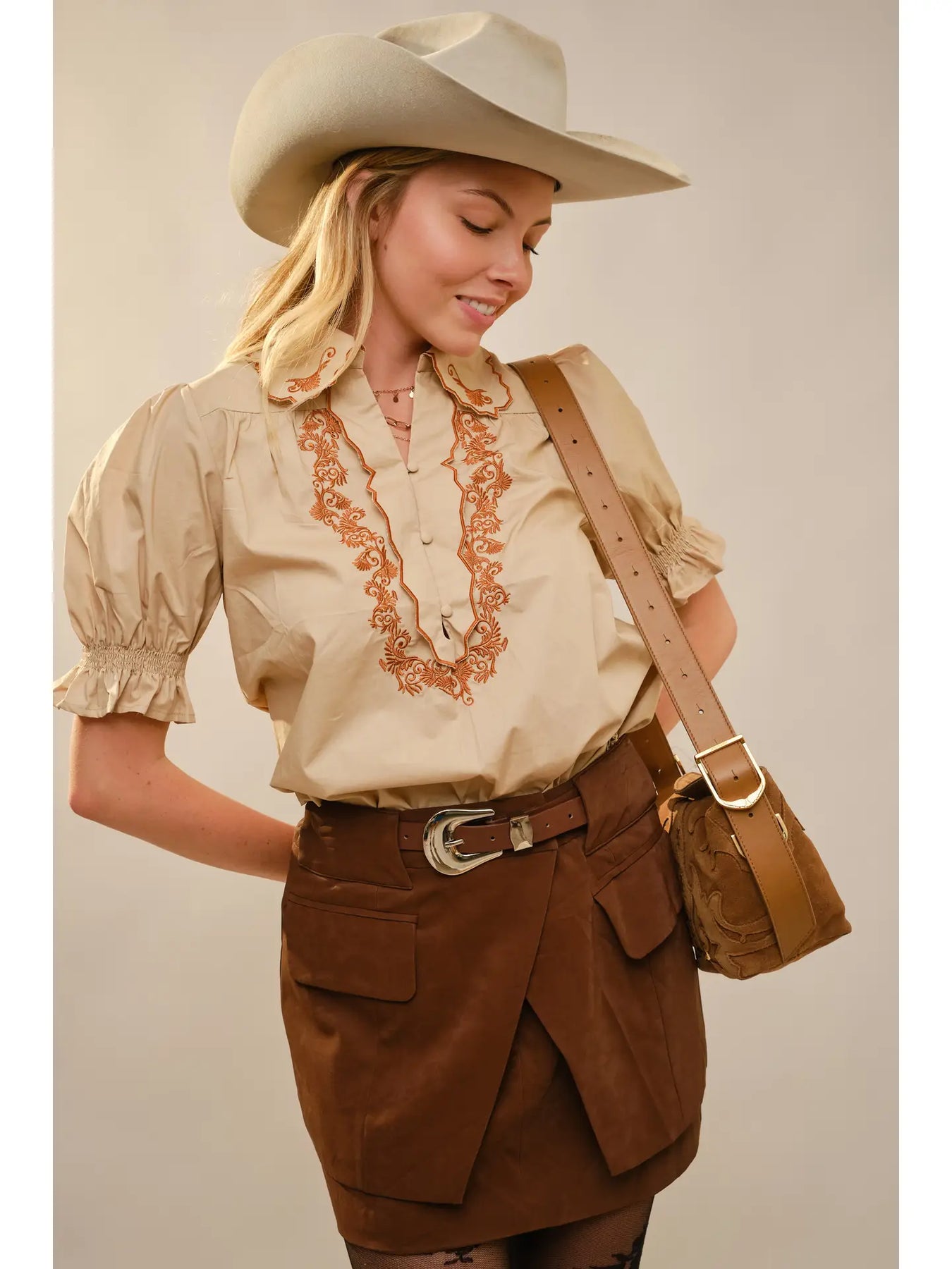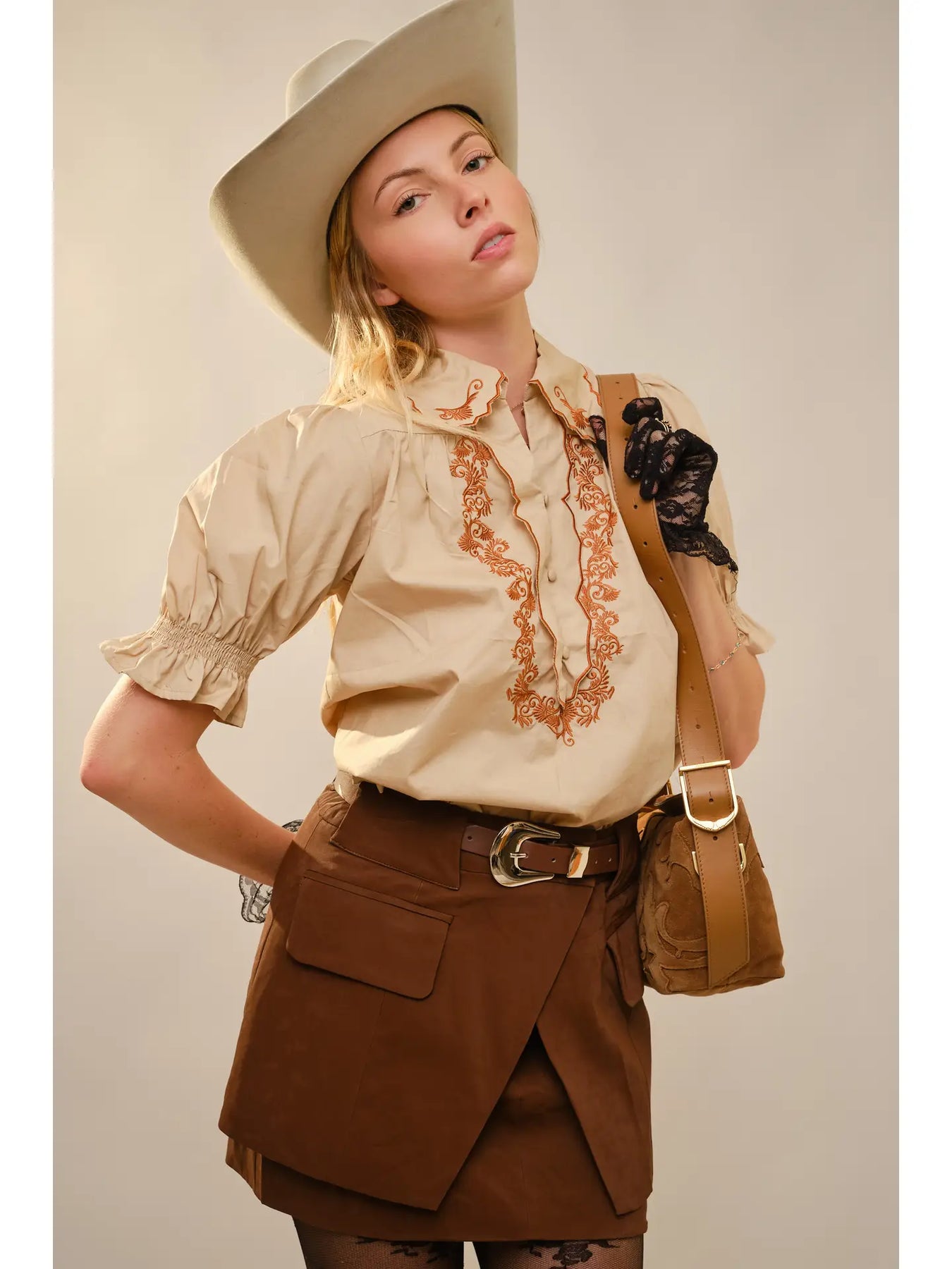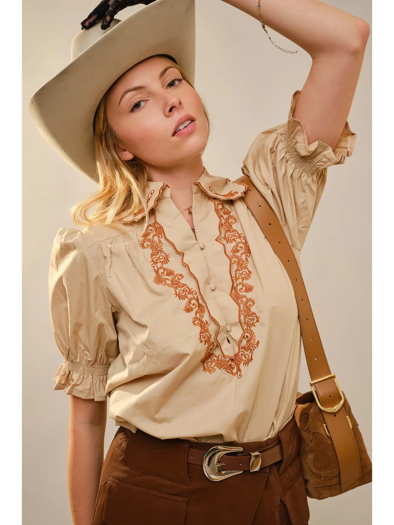 Lightweight cotton poplin top featuring intricate embroidery, a scalloped collar, and puff sleeves with smocked cuffs. Designed with a button-front detail. 100% Cotton Model is 5'10" and wears a size Small