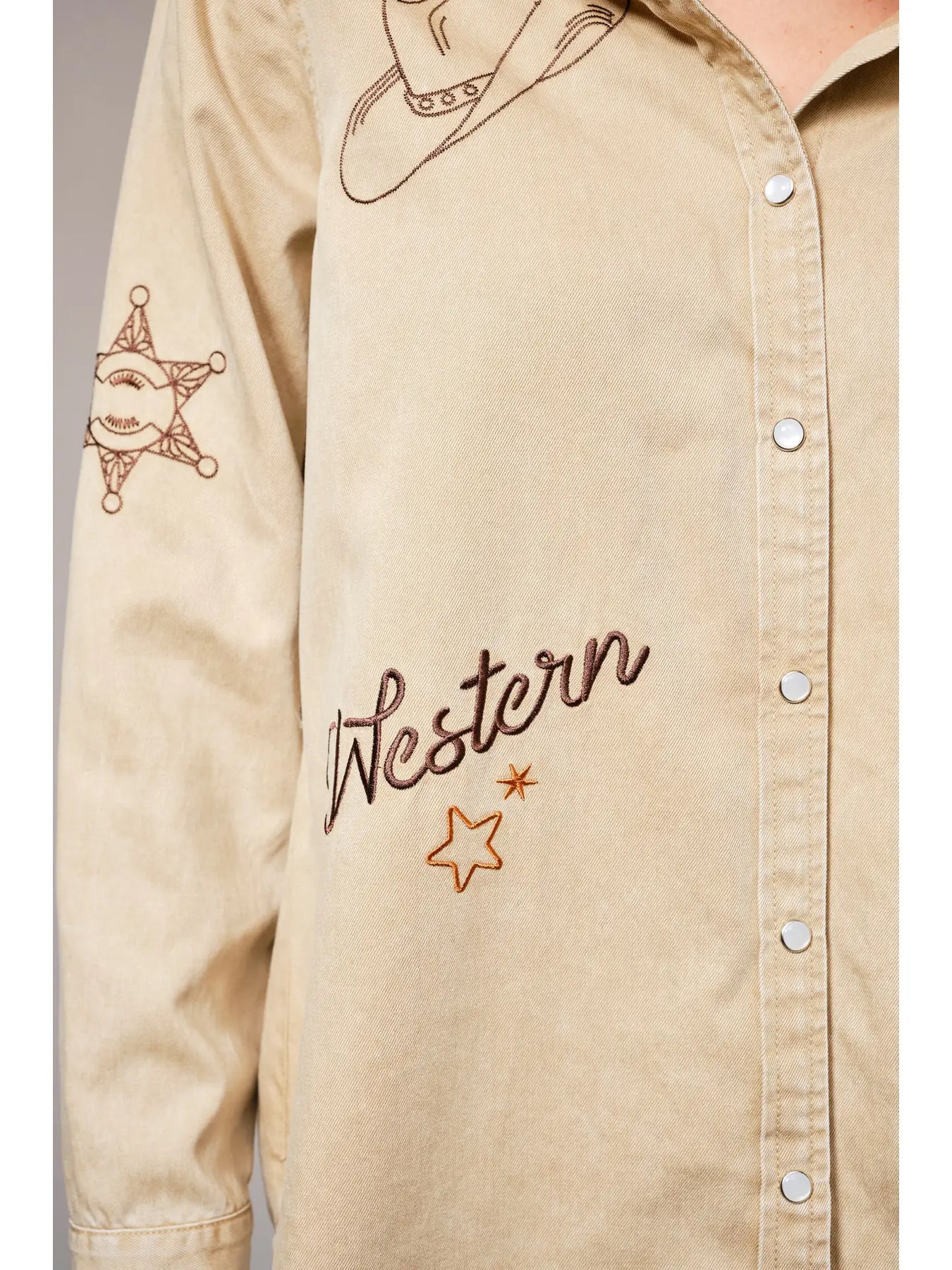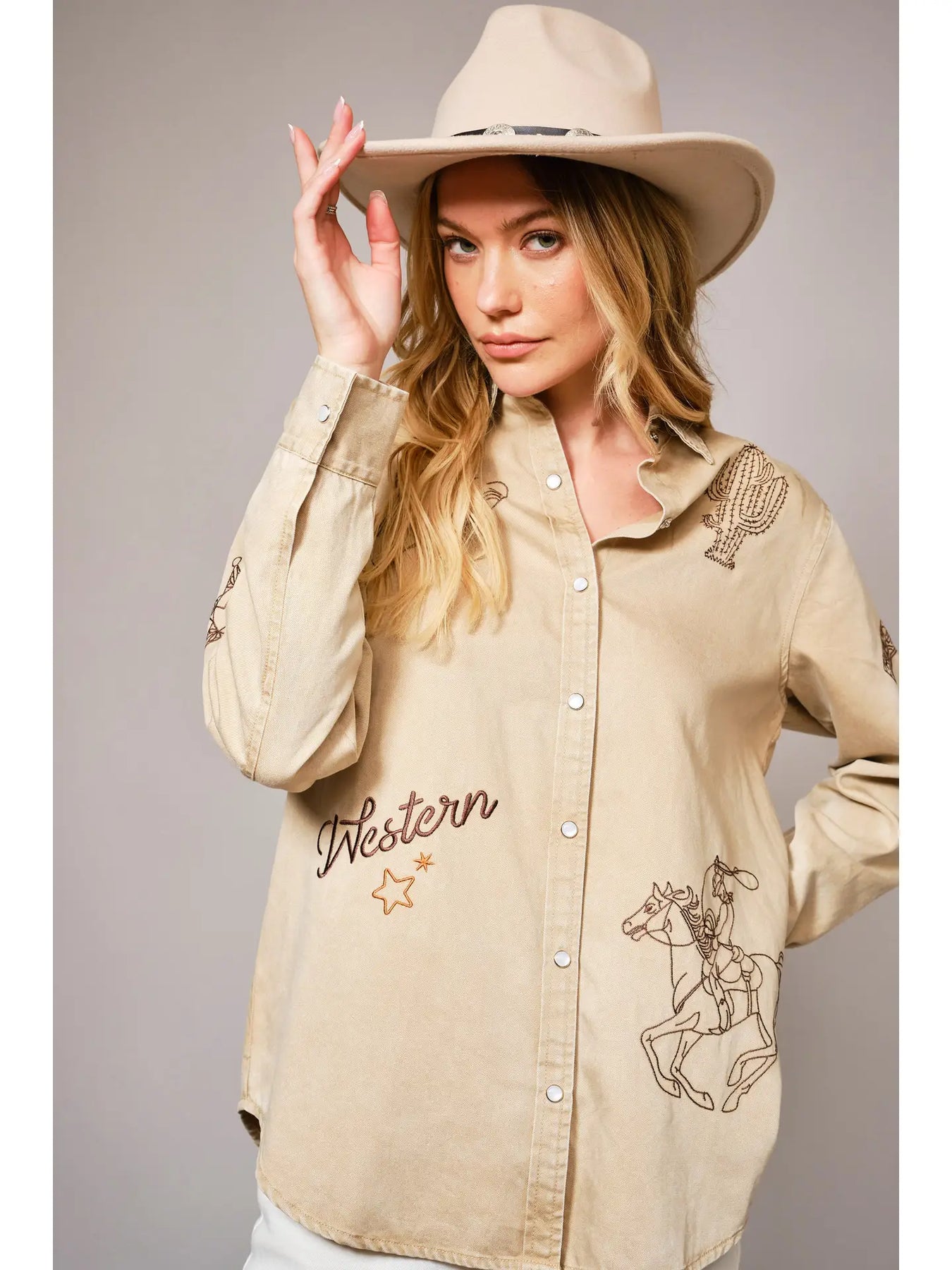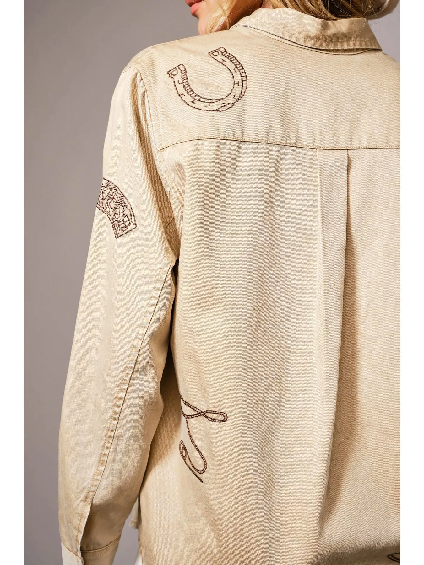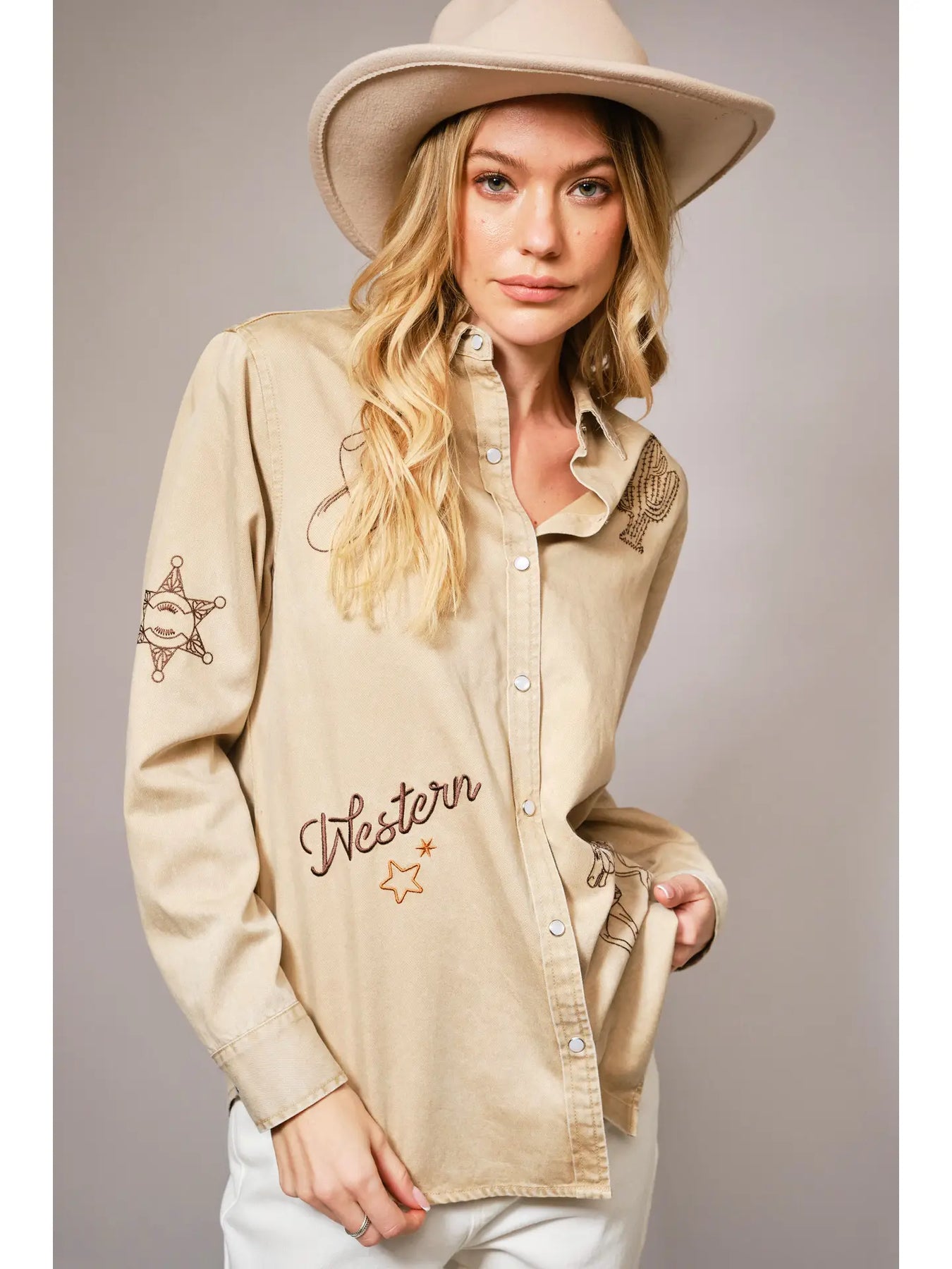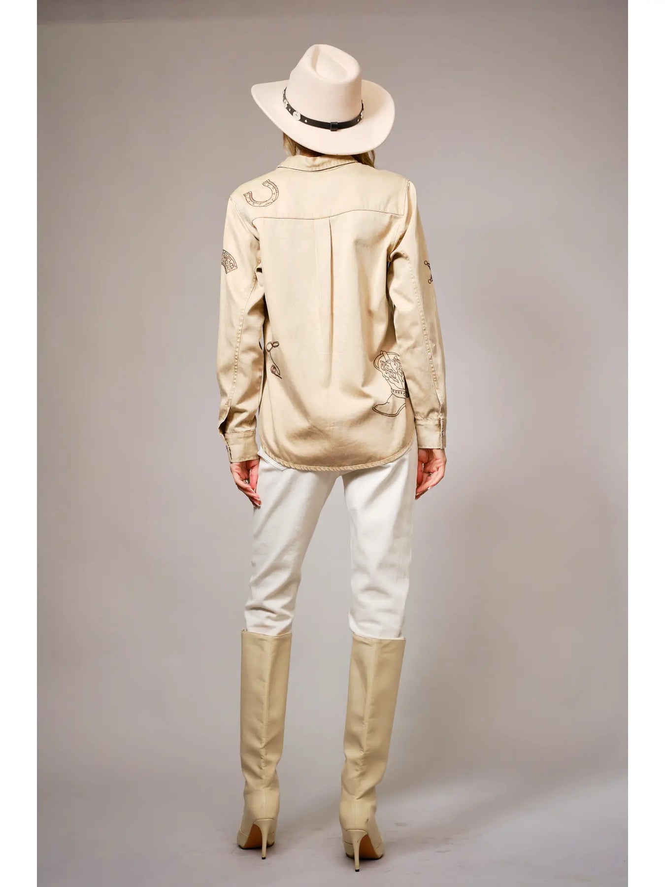 Lightweight cotton poplin top featuring intricate embroidery, a scalloped collar, and puff sleeves with smocked cuffs. Designed with a button-front detail. 100% Cotton Model is 5'10" and wears a size Small