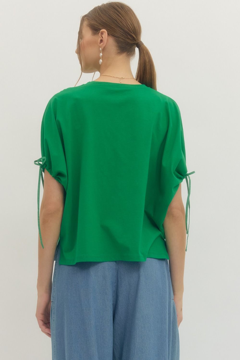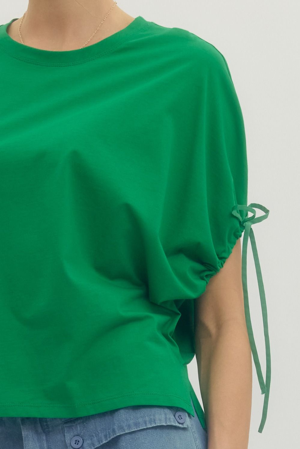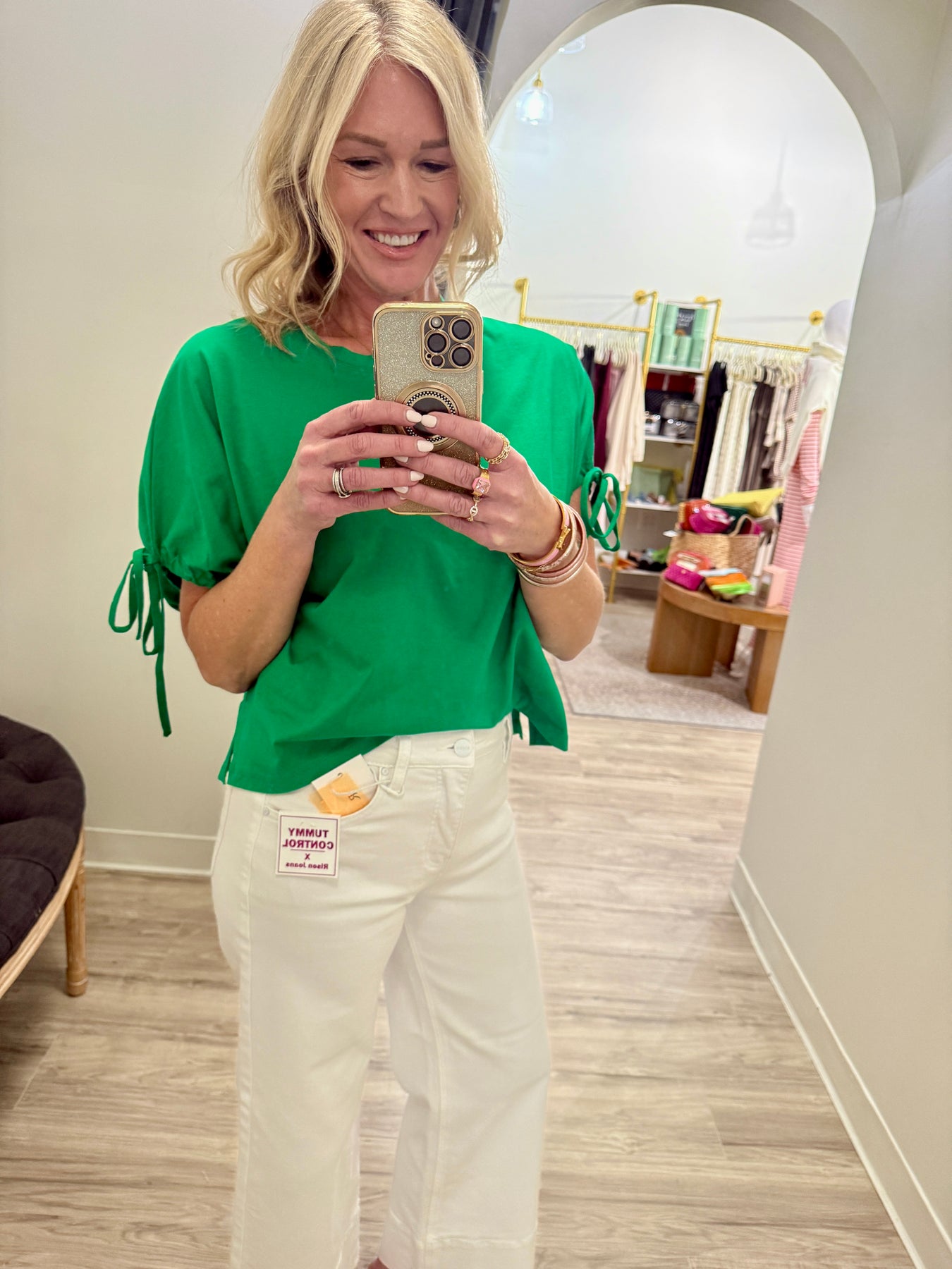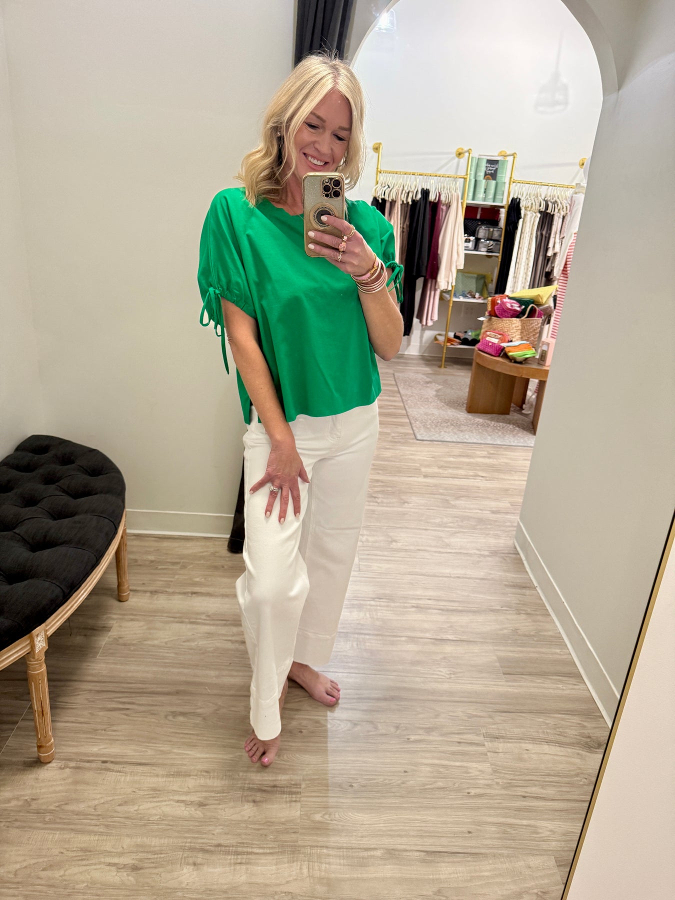 Flutter sleeve peplum top in cotton poplin fabric. This blouse features short, fluttered ruffle sleeves with top stitch detail, a split V-neckline, side zipper closure, pintuck detail at shoulder, cinched banded waist with stretch smock at back, and a removeable waist tie.