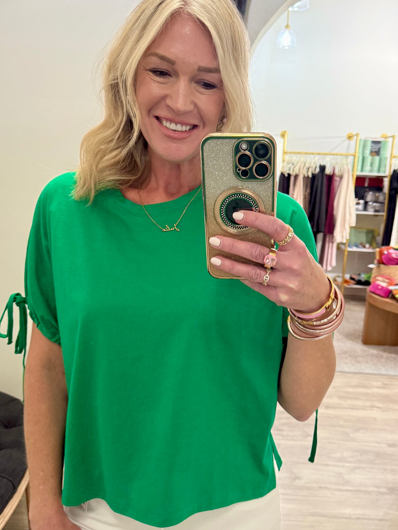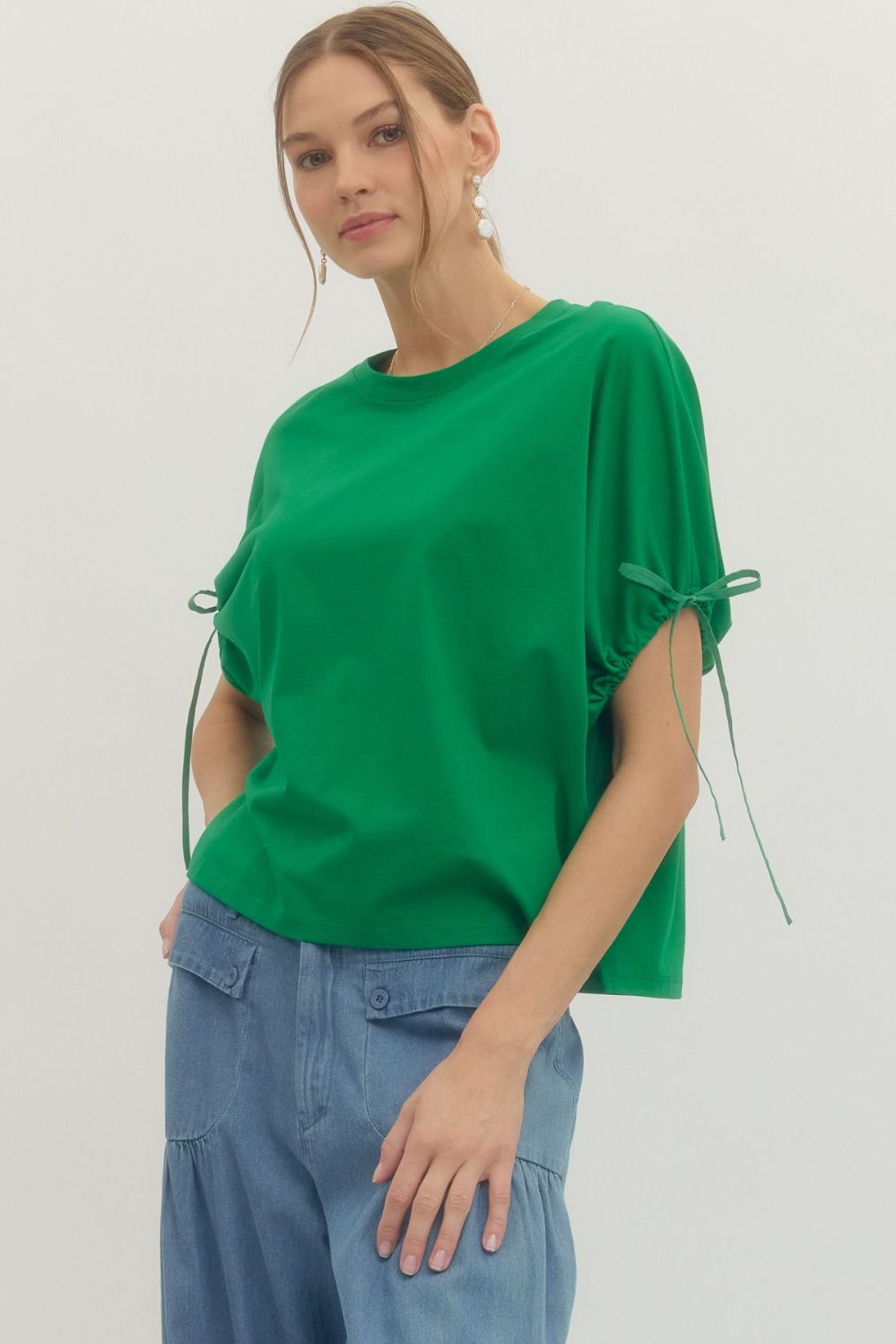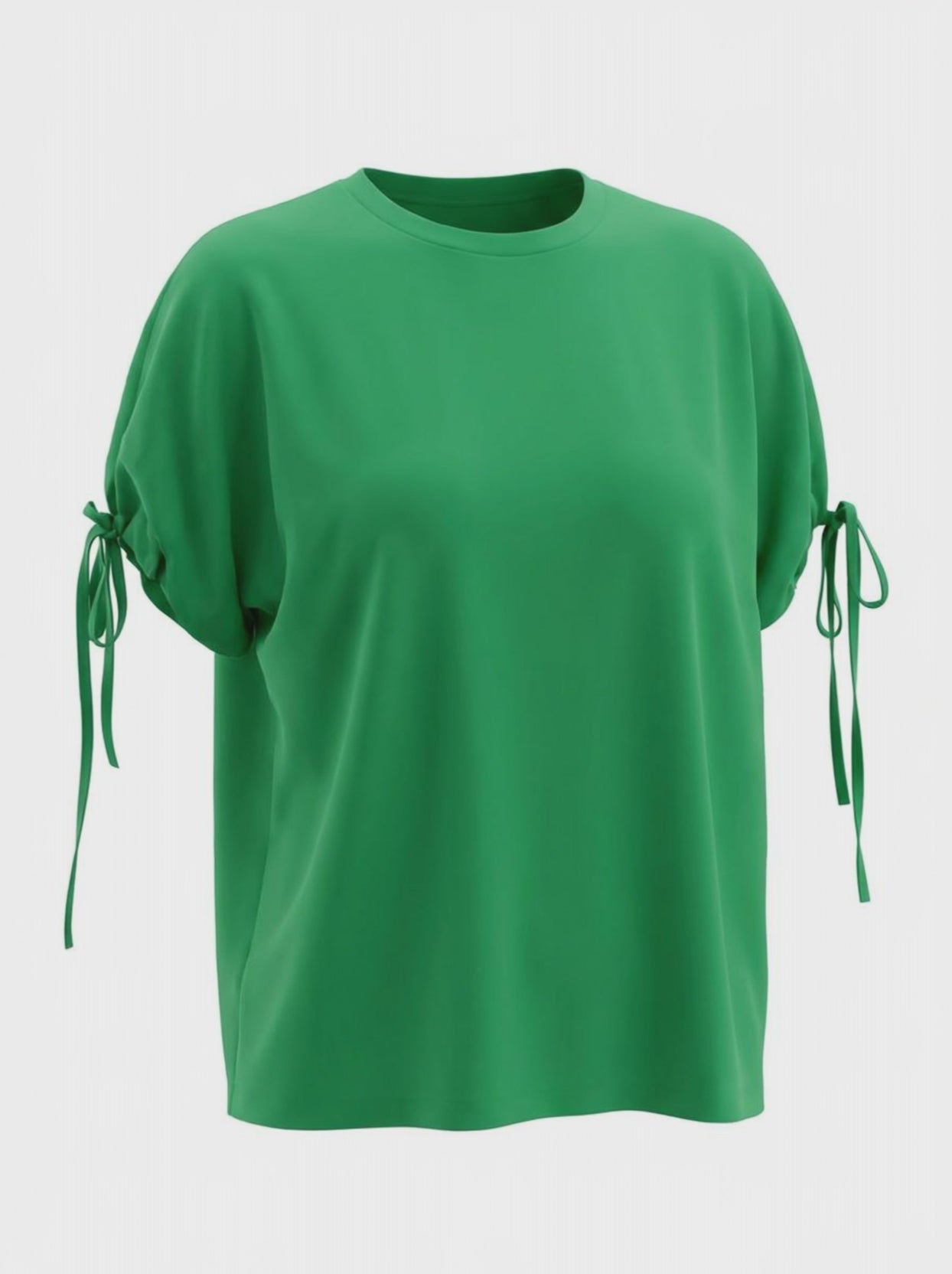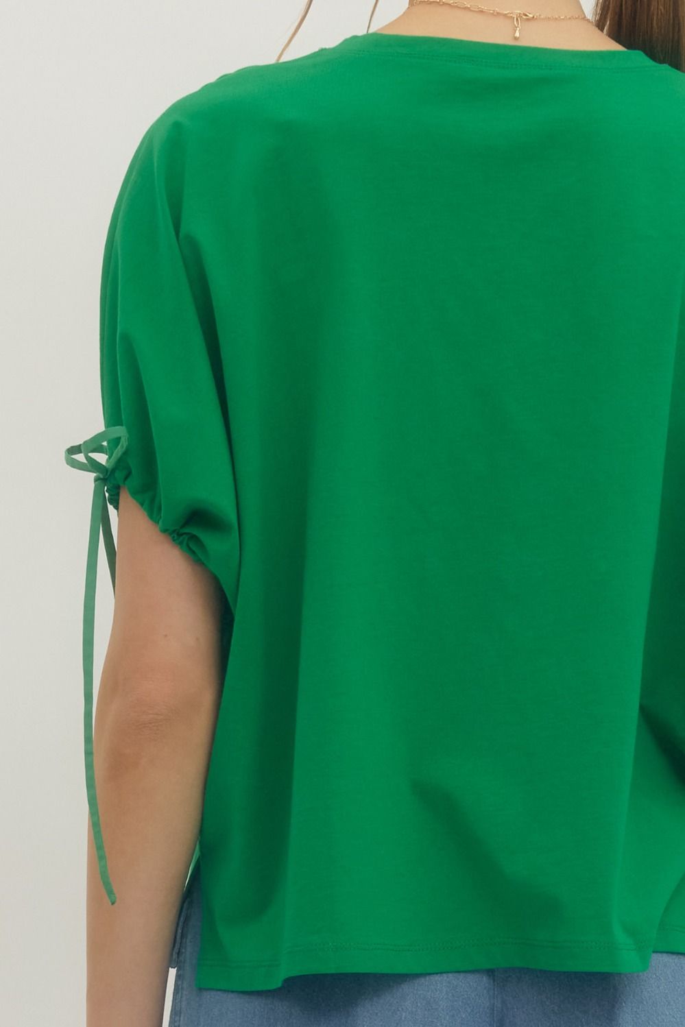 Flutter sleeve peplum top in cotton poplin fabric. This blouse features short, fluttered ruffle sleeves with top stitch detail, a split V-neckline, side zipper closure, pintuck detail at shoulder, cinched banded waist with stretch smock at back, and a removeable waist tie.