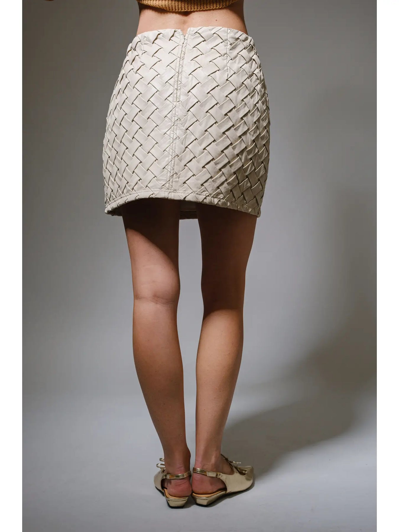 Mini skirt crafted from faux leather featuring a unique woven design throughout. Perfect for pairing with a blouse or knit top for a sleek and modern look.
