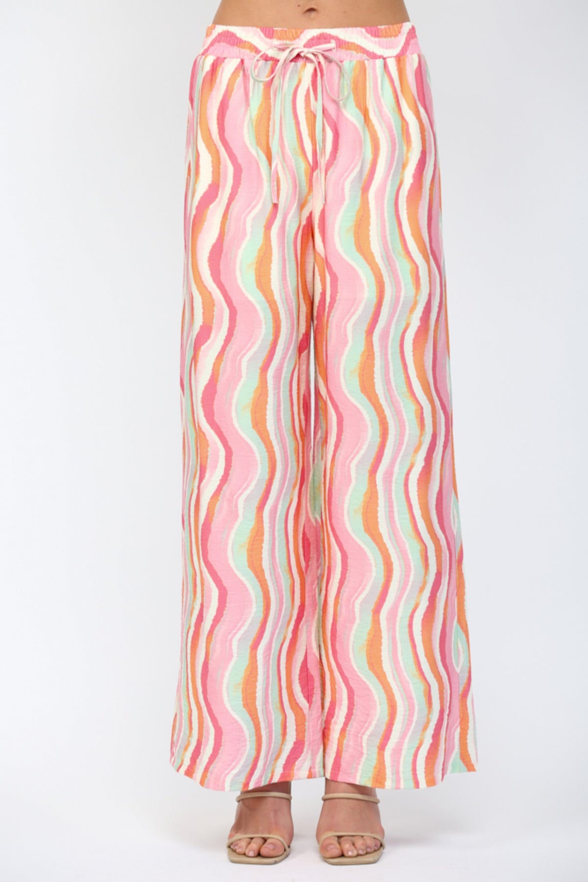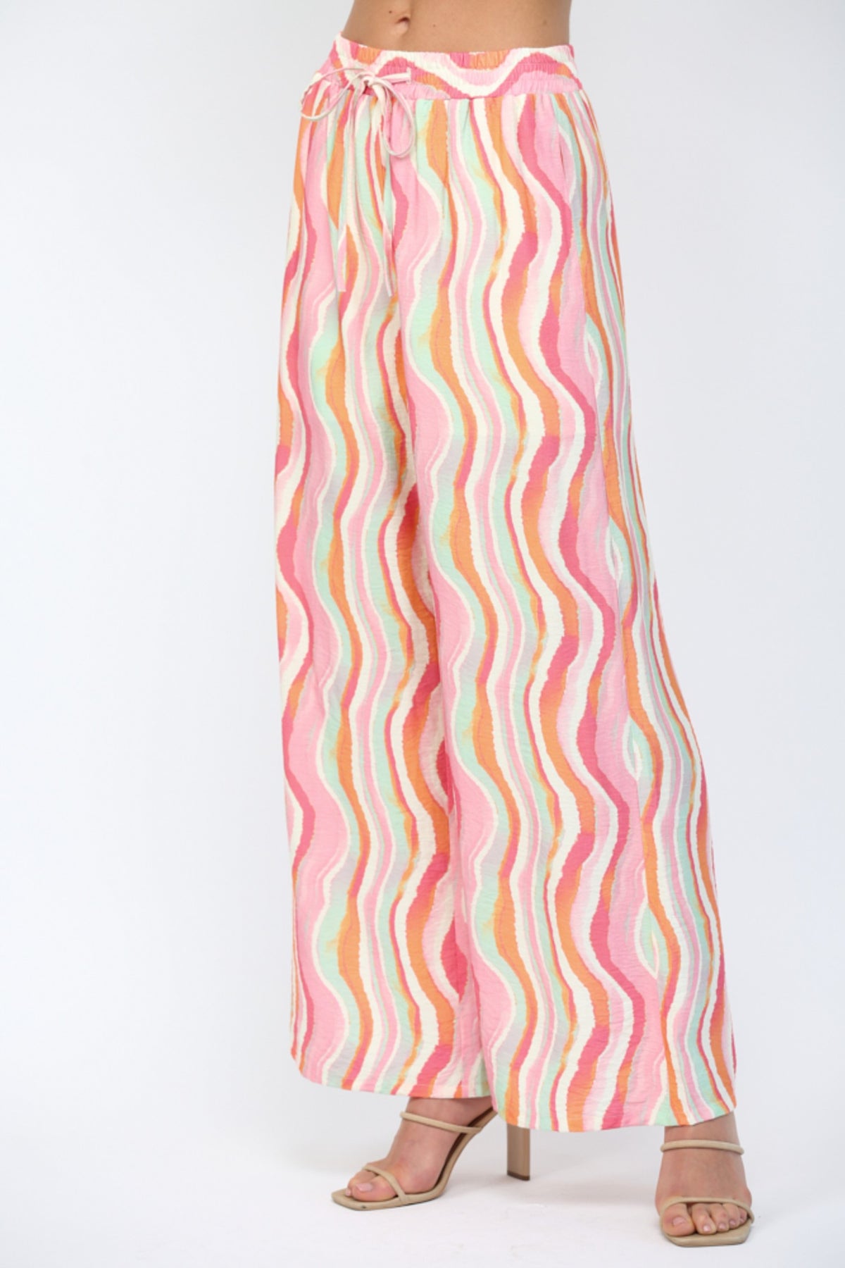Effortlessly chic wavy stripe pants featuring a cream multi palette, complete with an elastic waistband, adjustable drawstring, and practical side pockets—the perfect staple for any curated wardrobe.