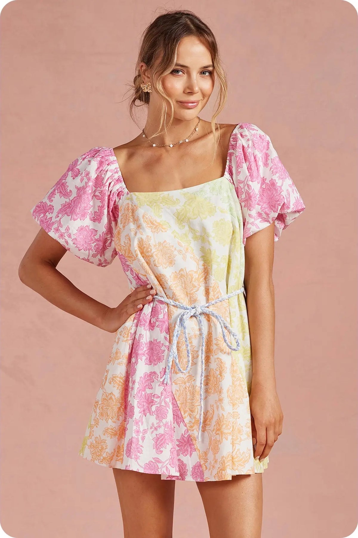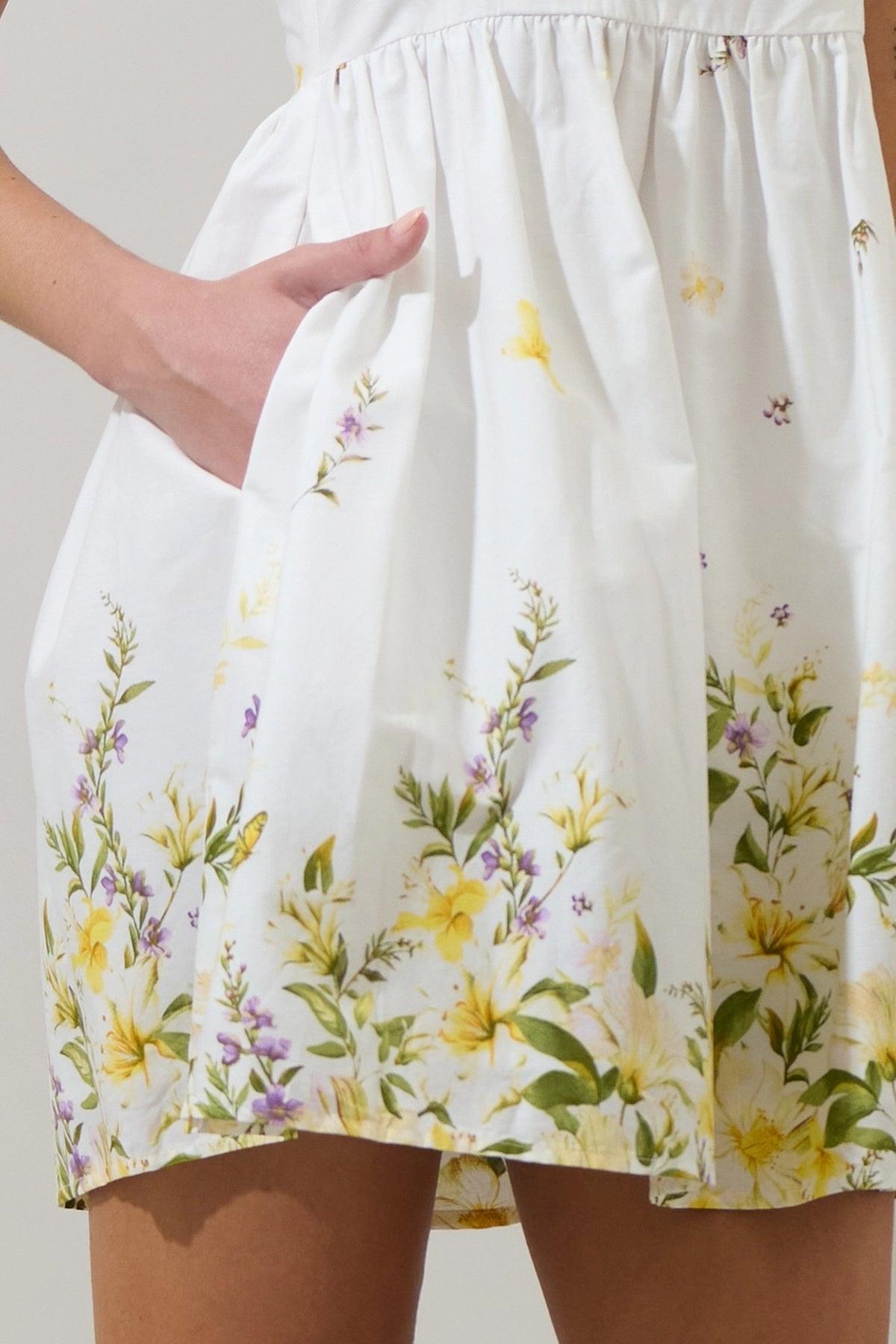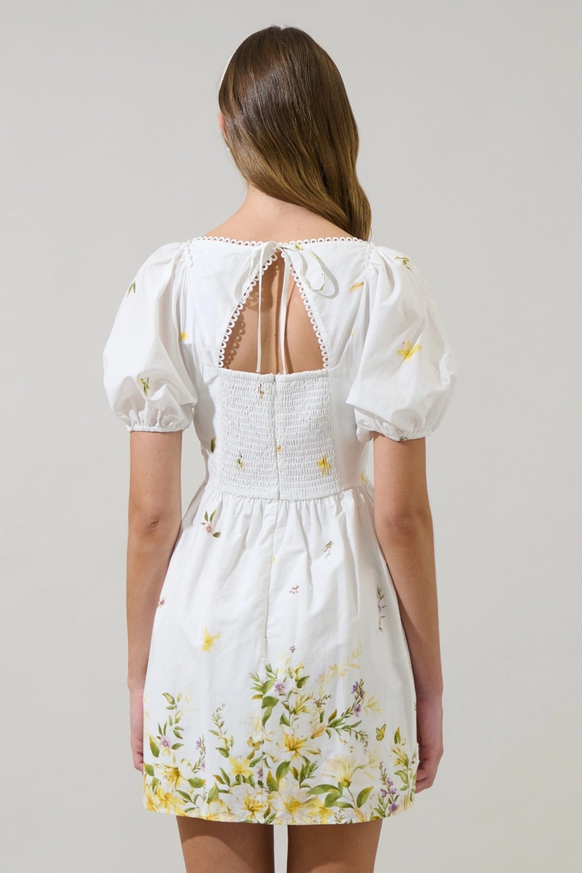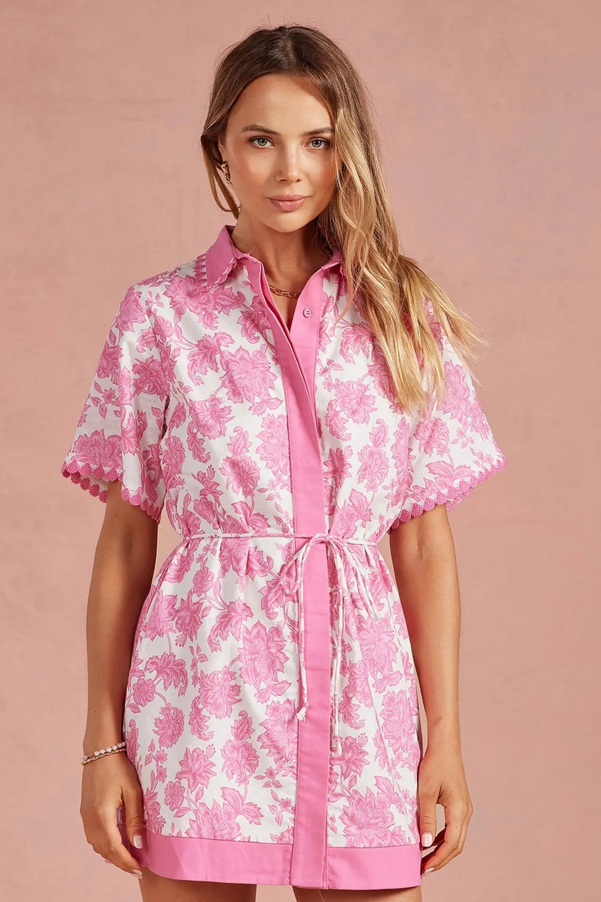 Crochet trim shirt mini dress in an exclusive botanical garden floral print on cotton linen blend fabric. This tropical preppy mini shirt dress features a spread collar, short sleeve with scallop crochet trim, relaxed fit, contrast color fabric at placket/collar/hem, placket button down closure at front, removable waist tie belt, side pockets and lining. The perfect dress for a casual weekend, beach to bar cover-up, vacation or a day event.