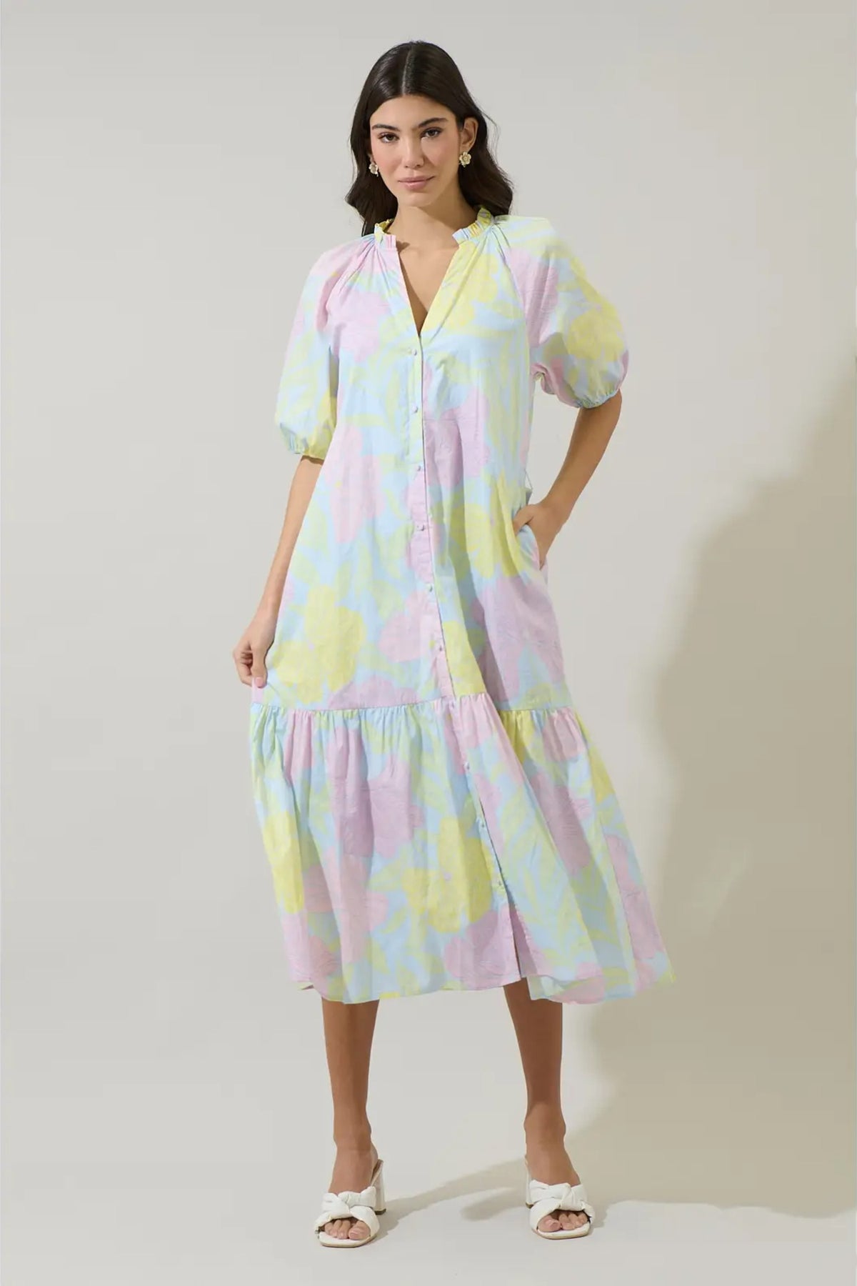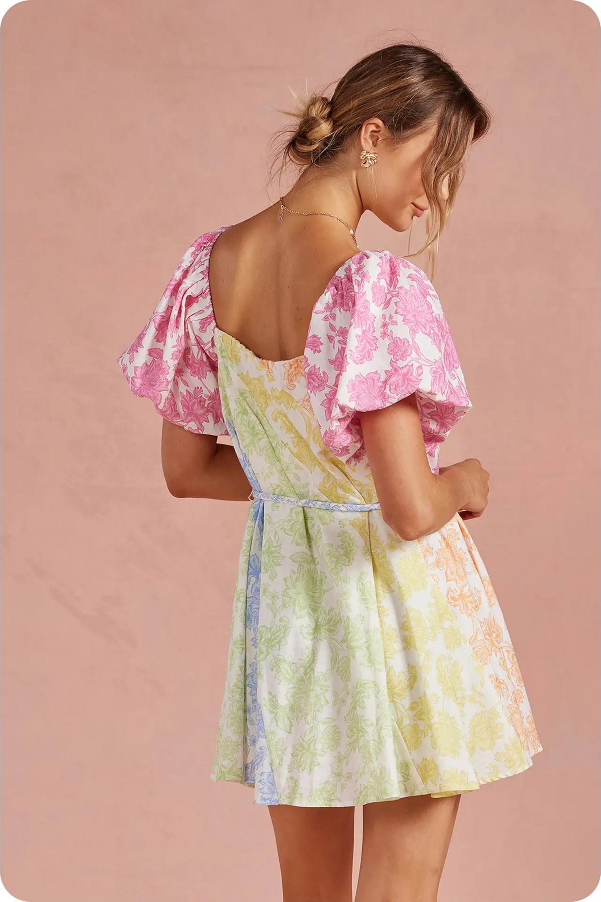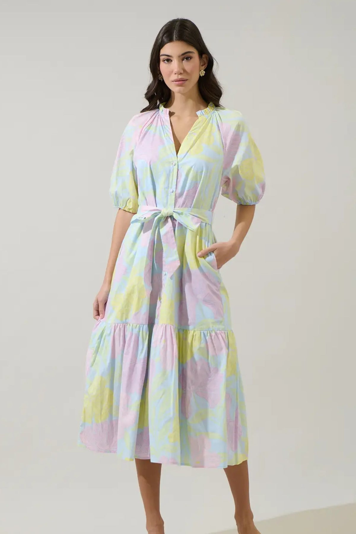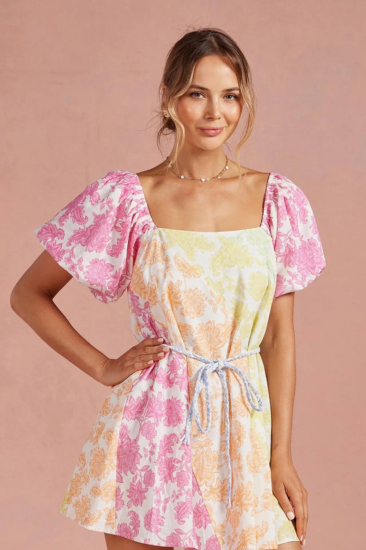 Crochet trim shirt mini dress in an exclusive botanical garden floral print on cotton linen blend fabric. This tropical preppy mini shirt dress features a spread collar, short sleeve with scallop crochet trim, relaxed fit, contrast color fabric at placket/collar/hem, placket button down closure at front, removable waist tie belt, side pockets and lining. The perfect dress for a casual weekend, beach to bar cover-up, vacation or a day event.