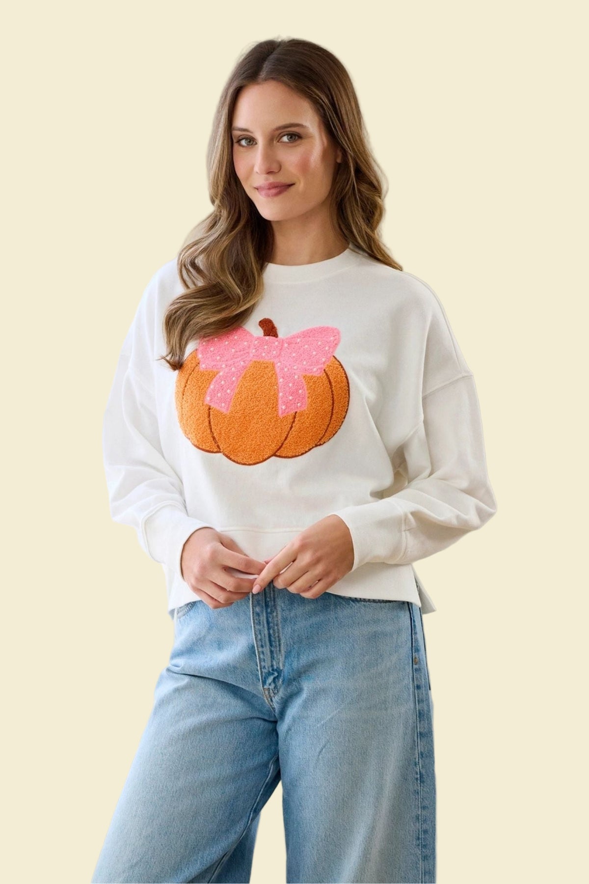 Made from 55% cotton and 45% polyester with faux pearls. Machine wash, tumble dry low, Fall just got a little more fabulous with this cozy-cute sweatshirt featuring a chenille pumpkin topped with a sparkly pink bow. Designed with a relaxed fit and soft cotton blend, it's perfect for sipping cider, pumpkin-picking, or lounging in style. The ivory hue makes it an easy match with your favorite denim, leggings, or skirts. Consider it your go-to for all things autumn, with a sweet twist!