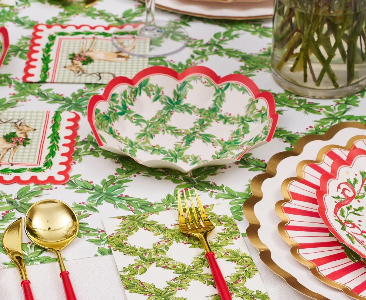 Quantity: The pack contains 8 plates. * Material: Paper * Size: 8", perfect for side dishes, salads, cake, and more! * Color: Green and red with gold foil trim