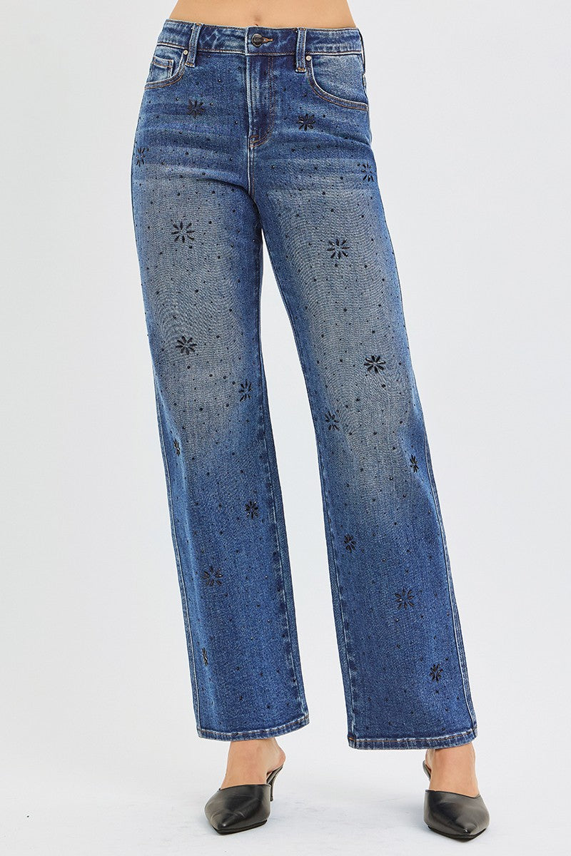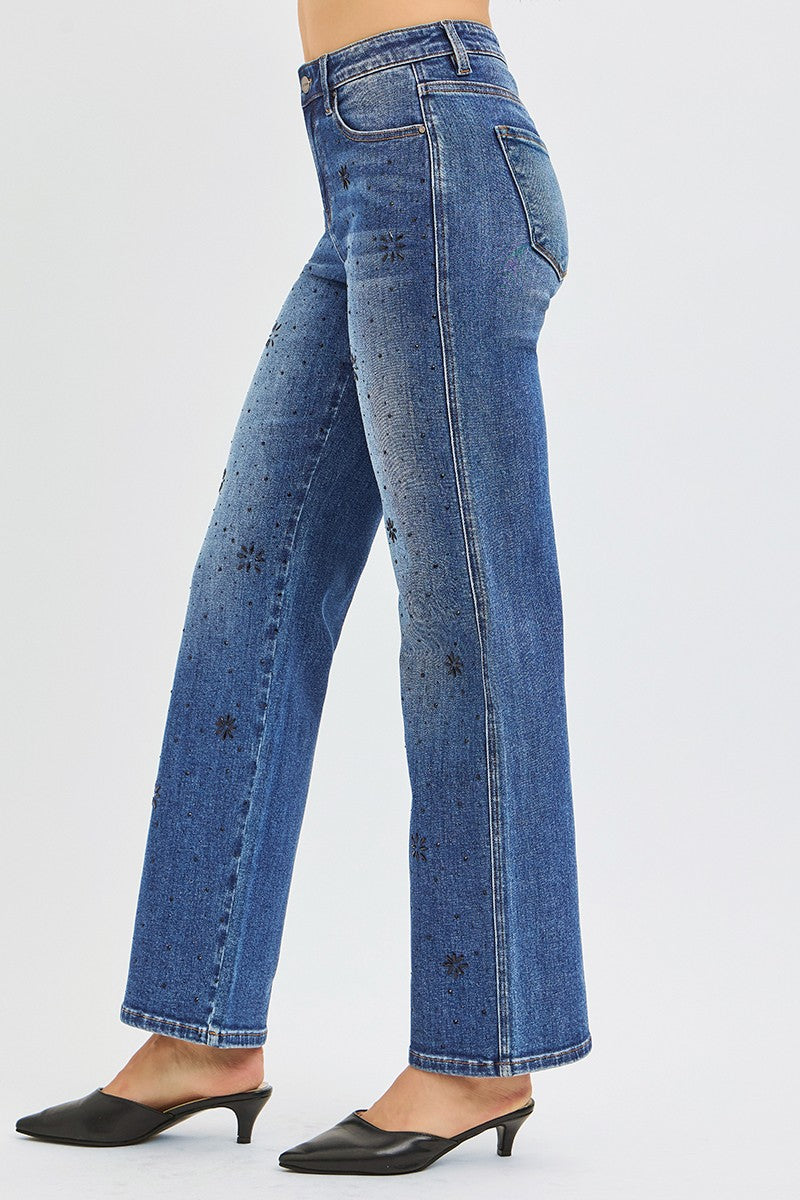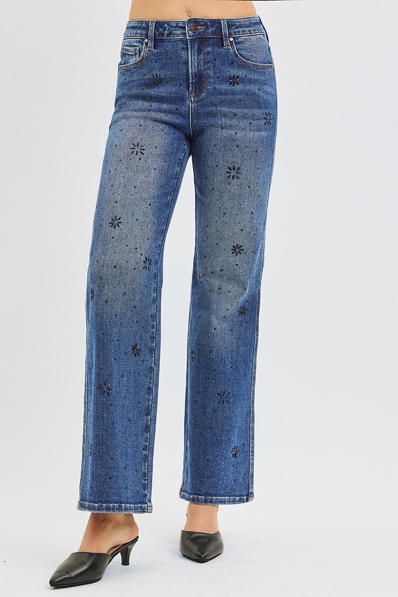 High Rise Straight Leg Rhinestone Jeans